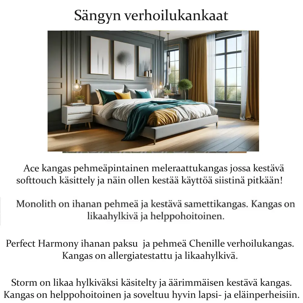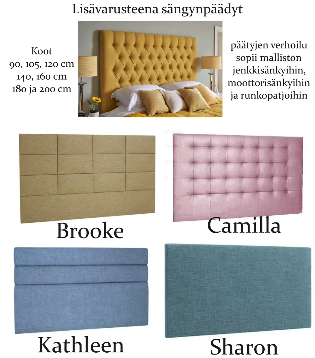 Täydennä sänkysi yhteensopivalla sängynpäädyllä, päätypenkillä sekä laadukkailla peitto- ja tyynyseteillä. Suosittelemme lisäksi Pouta-sijauspatjansuojaa, joka suojaa patjaa ja pidentää sen käyttöikää.