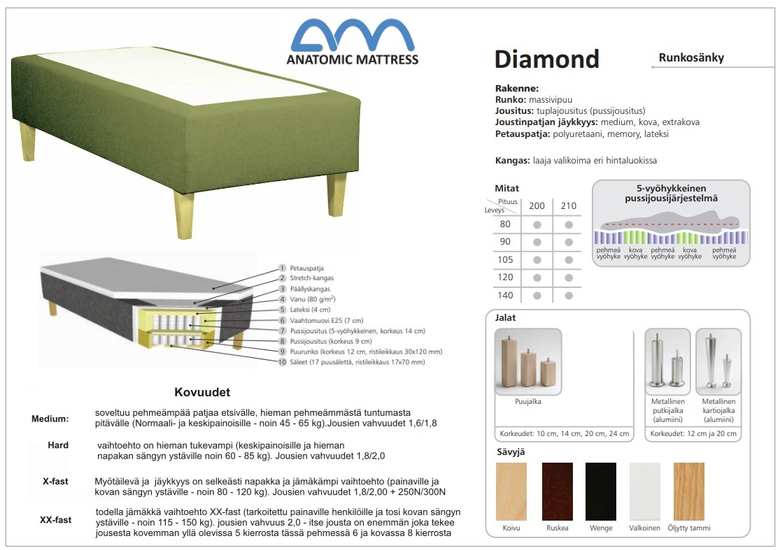 Diamond-runkopatja on saatavilla neljällä eri kovuudella – medium, hard, X hard ja XX hard – jotta voit valita juuri omaan kehoosi sopivan vaihtoehdon. Voit viimeistellä nukkumismukavuuden kolmella erilaisella sijauspatjalla: vaahtomuovi-, memory- tai latex-mallilla, jokaisesta perus- tai premium-versiona. Irrotettavat ja vesipestävät päälliset sekä useat verhoiluvaihtoehdot tekevät patjasta käytännöllisen ja pitkäikäisen.