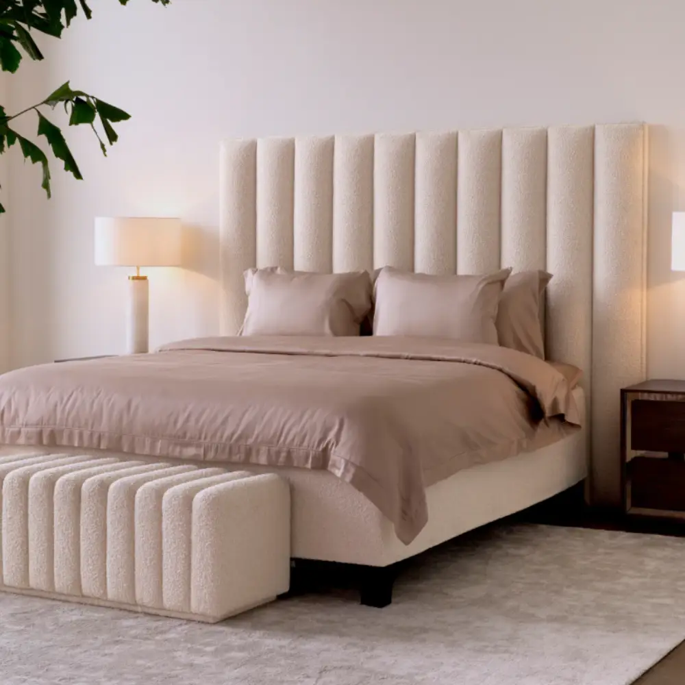 Ditmar-sängynpääty tuo makuuhuoneeseesi ylellisen ja rauhoittavan ilmeen beigen kangasverhoilunsa tai kermansävyisen bouclé-kankaan ansiosta. Sen harmoninen muotoilu viimeistelee makuutilan tyylikkäästi ja ajattomasti.