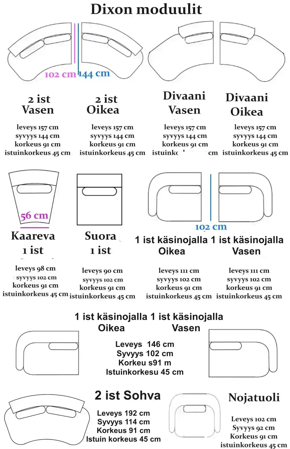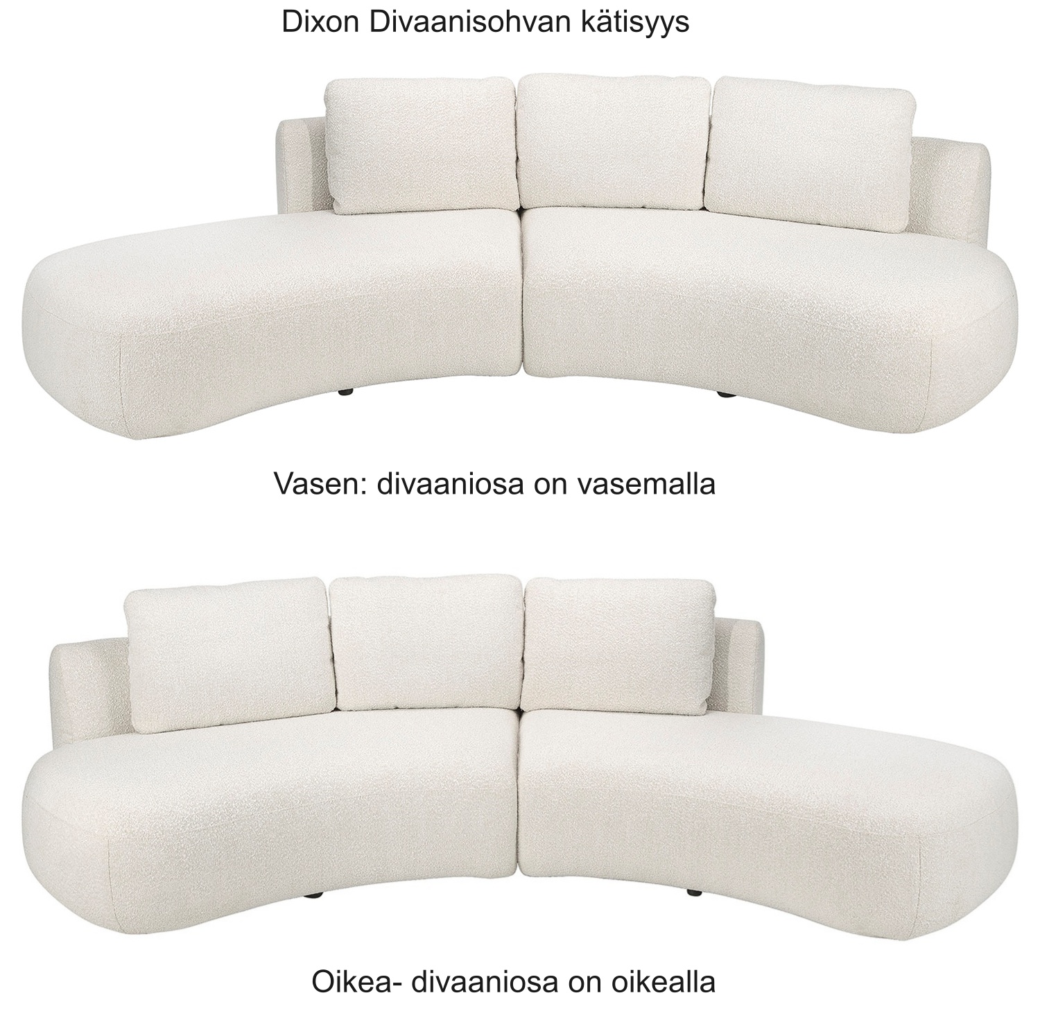 Dixon divaanisohva on näyttävä ja muunneltava moduulisohva, jossa yhdistyvät suorat linjat ja pehmeästi pyöristetyt muodot. Se nostaa sisustuksesi uudelle tasolle ja sopii yhtä hyvin kotiin kuin julkisiin tiloihin. Yhdistelemällä eri moduuleja voit luoda juuri omaan oleskelutilaasi sopivan kokonaisuuden – ja sarjaan on saatavilla myös saman malliston nojatuoli.