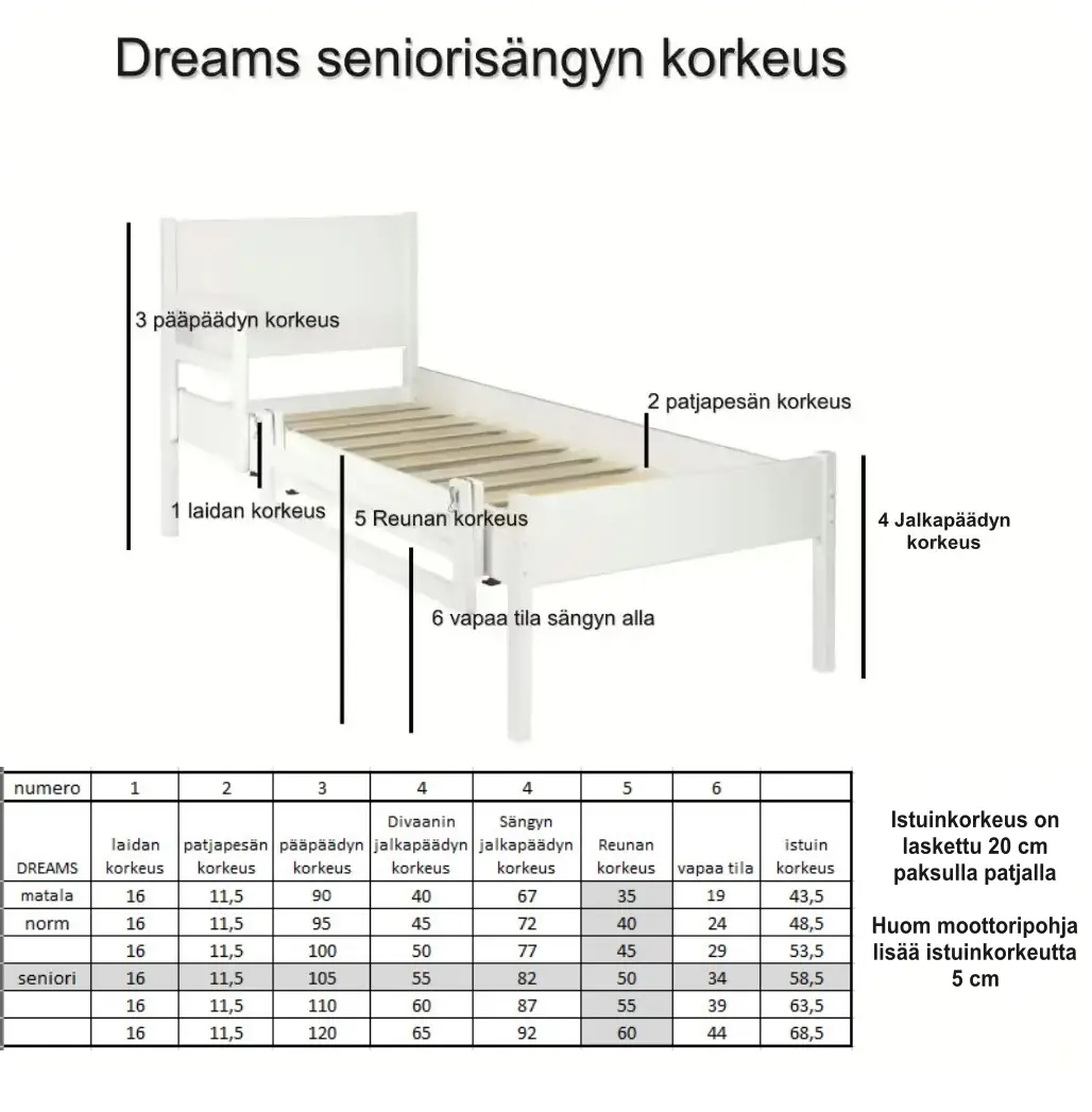 Dreams seniorisänky on laadukas, Suomessa valmistettu sänky, jossa yhdistyvät kestävä koivurunko, tyylikäs muotoilu ja turvallisuutta lisäävät yksityiskohdat. Sälepohja ja vahva rakenne tekevät sängystä pitkäikäisen ratkaisun, joka tarjoaa erinomaisen tuen ja vakauden jokaiselle nukkujalle. Saatavilla kaksi mallia – perinteinen jalkapäädyllä tai divaanimalli ilman jalkapäätyä – sekä mahdollisuus erikoiskokoihin.