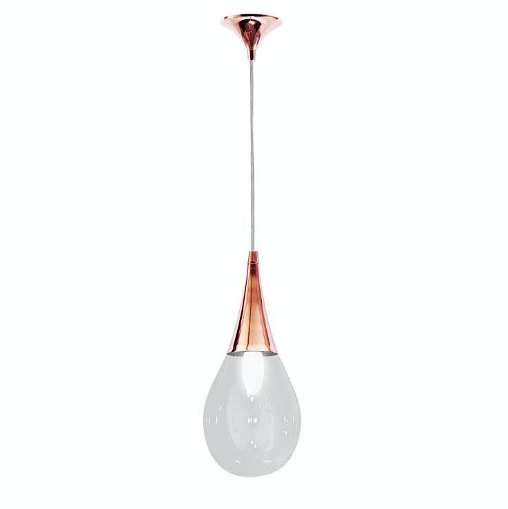Upea ja näyttävä Drop 1 riippuvalaisin hurmaa kuparinvärisellä metallirungollaan ja hiekan sävyisellä lasikuvulla, jotka yhdessä luovat lämpimän ja ylellisen kokonaisuuden. Sirolinjainen muotoilu tekee valaisimesta näyttävän mutta kevyen sisustuselementin keittiöön, ruokailutilaan tai tunnelmalliseksi korostusvaloksi.