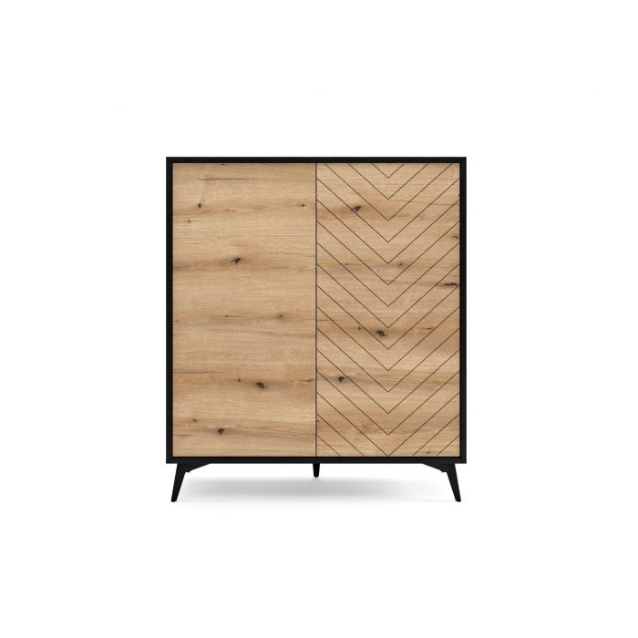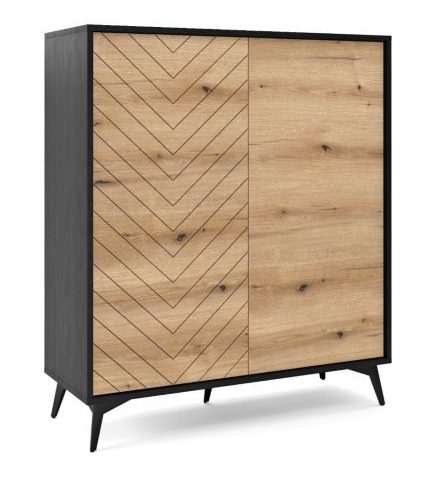 Dumont-kaappi tuo sisustukseen tyylikkyyttä ja lämpöä tammenväristen etusarjojen sekä näyttävän koristekuvion ansiosta. Mustat metallijalat ja huoliteltu 16 mm laminoitu runko ABS-reunanauhalla tekevät kaapista ryhdikkään ja pitkäikäisen osan kodin säilytyskalusteita.
