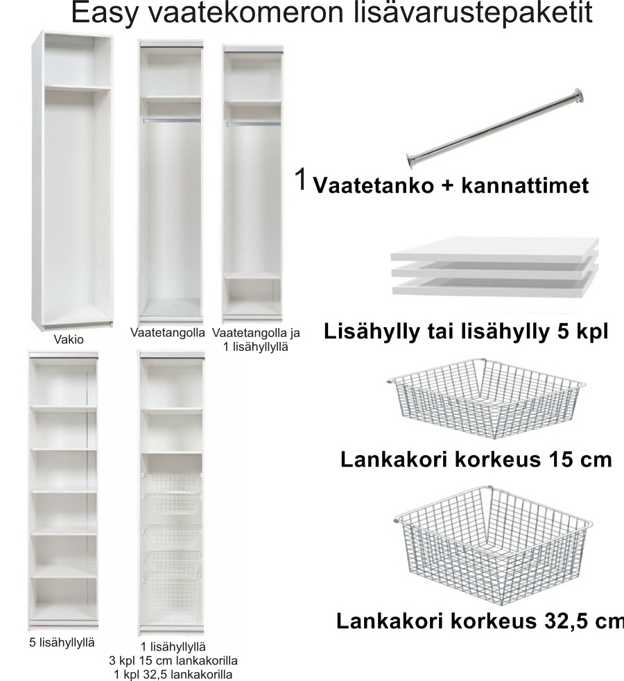 Easy vaatekaappi yläkaapilla on kotimainen, laadukkaasti valmistettu vaatekaappi, jonka 45 cm korkea yläkaappi tarjoaa lisätilaa kodin säilytystarpeisiin. Kaappi toimitetaan ilman sisävarusteita, joten voit itse päättää, miten varustat sen – hyllyillä, tangolla tai korijärjestelmillä, jotka löytyvät helposti lisätarvikkeet-osiosta.