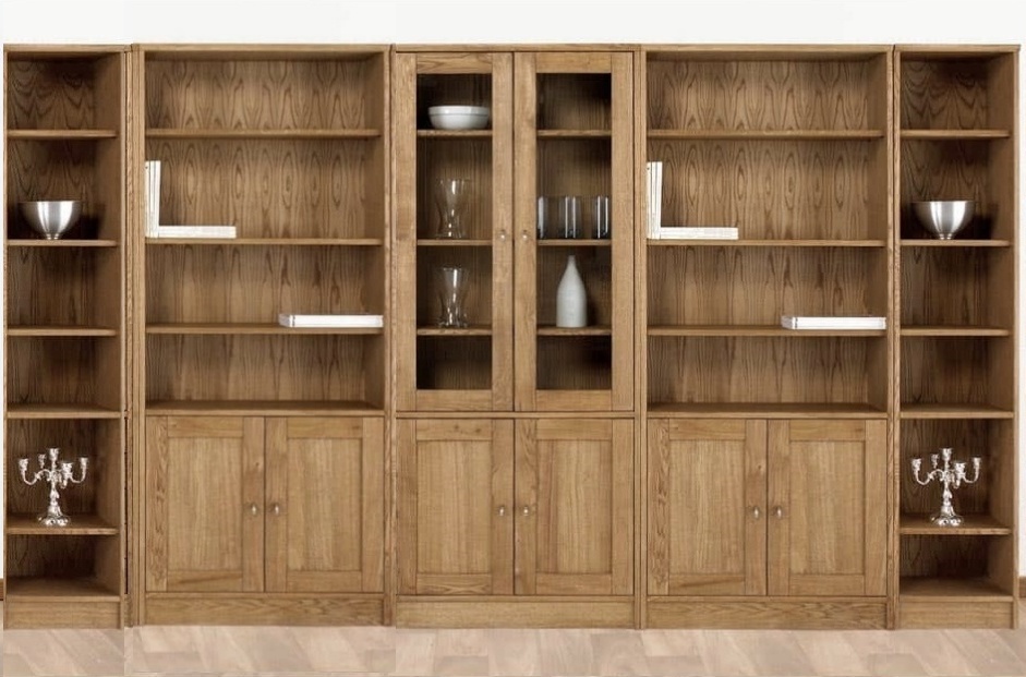 Kapeat ja leveät avohyllyt tarjoavat runsaasti tilaa kirjoille ja sisustusesineille, kun taas keskiosan vitriini lasiovilla mahdollistaa kauniin ja suojatun esillepanon. Kaikki osat voidaan järjestää vapaasti omaan mieltymykseen sopivaan järjestykseen, mikä tekee kokonaisuudesta joustavan eri tiloihin ja tarpeisiin.