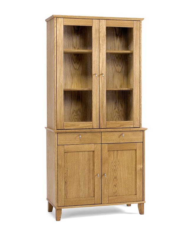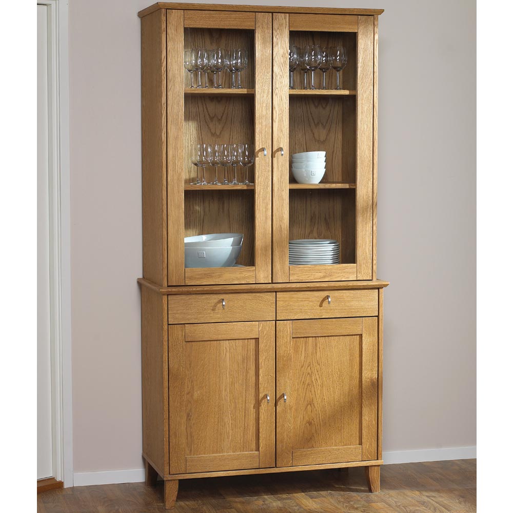 Vitriinin alaosassa on kaksi ovea, joiden takaa löytyy käytännöllistä säilytystilaa arjen tavaroille. Yläosan lasiovien takana olevat korkeussäädettävät tammihyllyt tarjoavat joustavan ratkaisun astioiden, lasien tai sisustusesineiden esillepanoon. Halutessasi voit tilata erikseen myös lasihyllyt, jotka lisäävät vitriinin keveyttä ja näyttävyyttä.