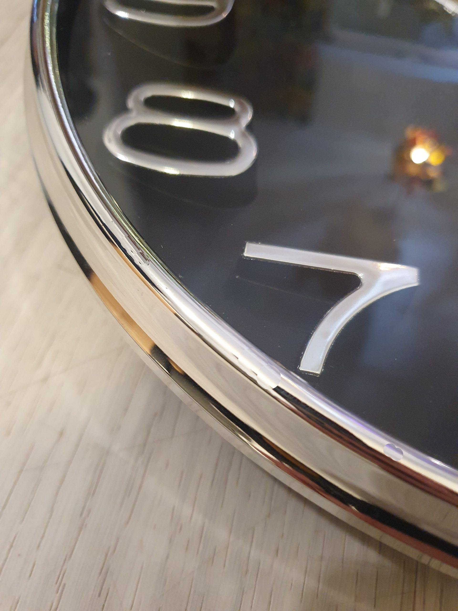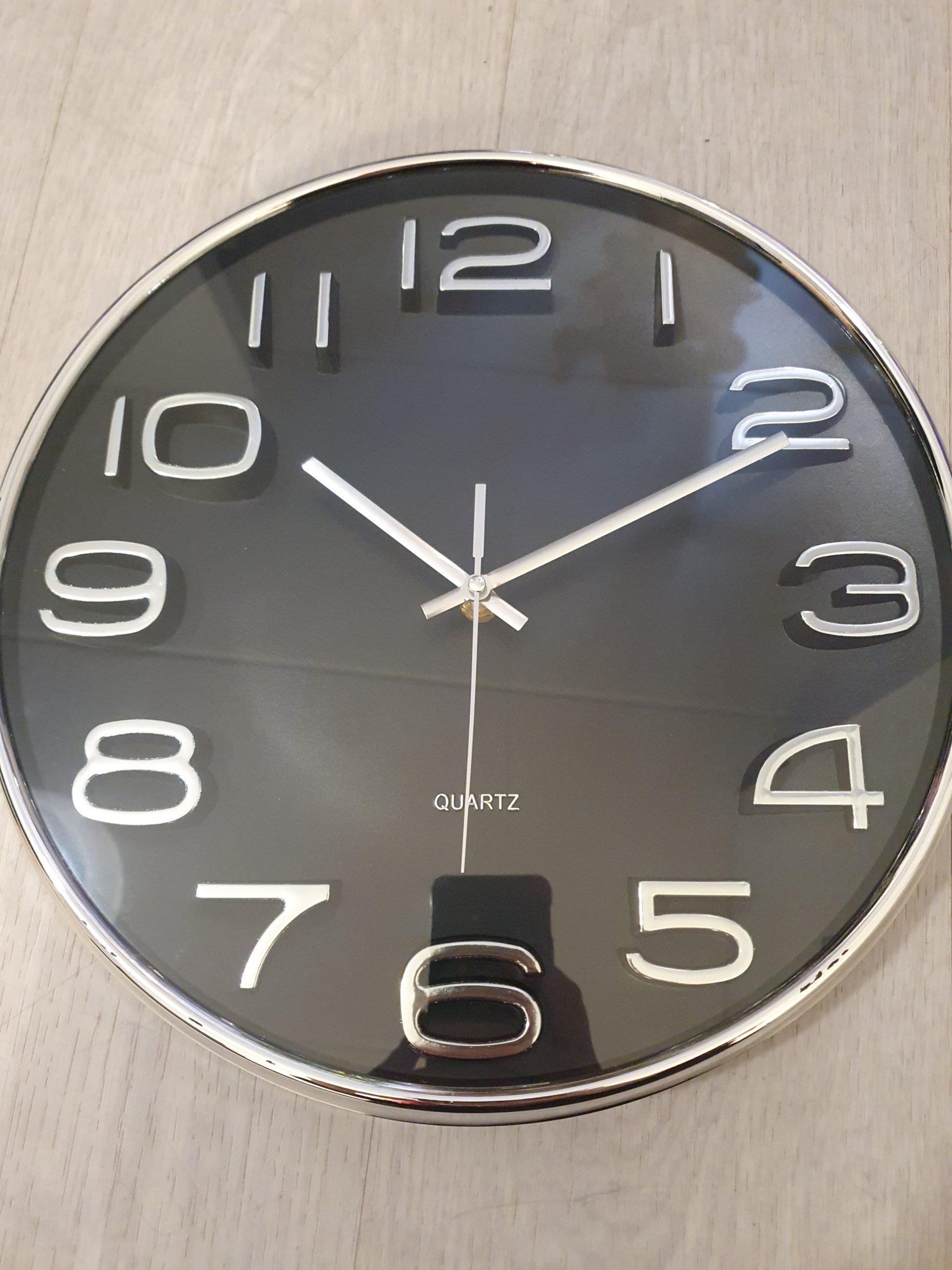 Elegant seinäkello yhdistää modernin mustan taustan ja hopeiset numerot, jotka luovat aikaan sopivan, näyttävän ja silti hillityn ilmeen. Sen selkeä muotokieli täydentää sekä kotien että toimistojen sisustusta tuoden tilaan ryhtiä ja eleganttia viimeistelyä.