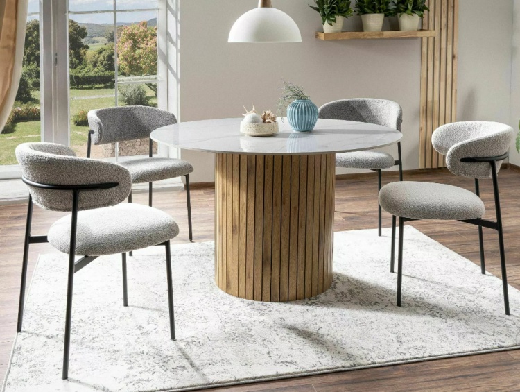 Elton tuoli yhdistää rouhean kangasverhoilun ja tukevan mustan metallirungon, luoden modernin ja monikäyttöisen ilmeen, joka sopii täydellisesti niin ruokailutilaan kuin työhuoneeseen.