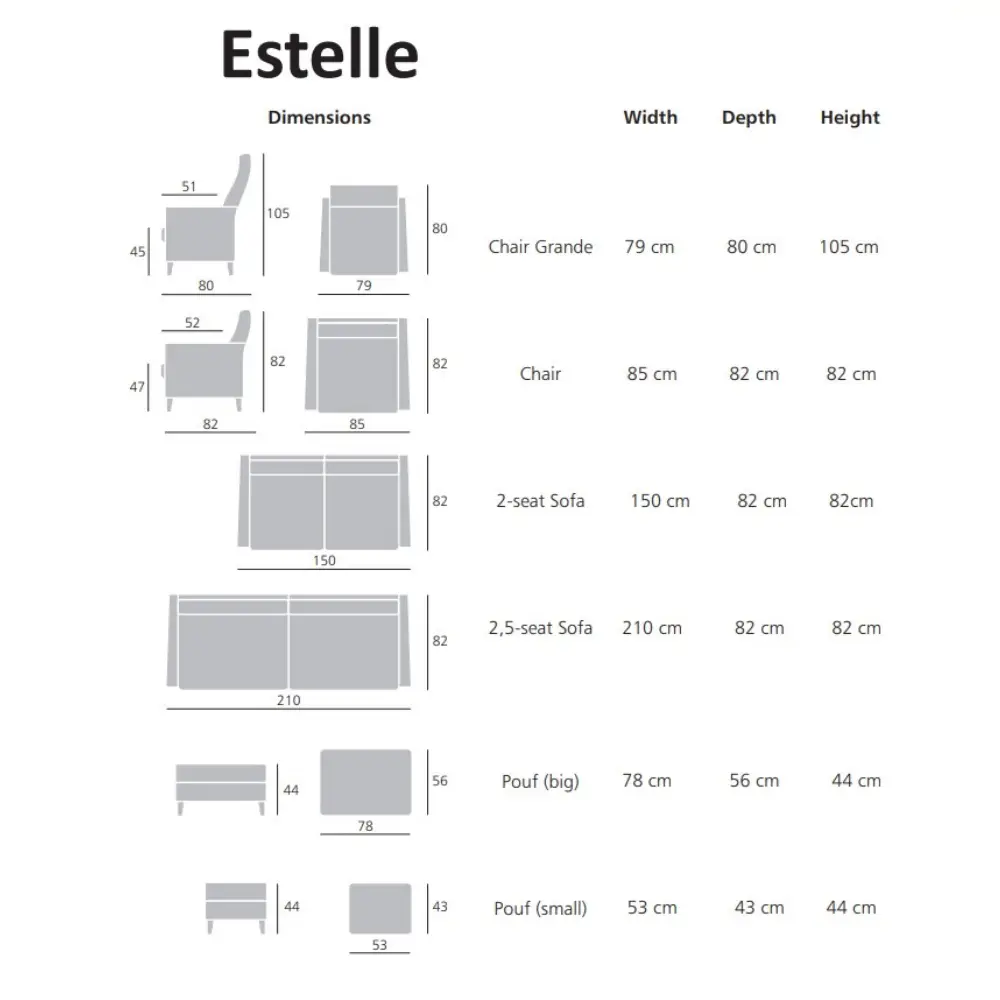 Estelle sohvakalusto sisältää nojatuolin, 2 ist sekä 2,5 ist sohvan. Estelle sohva on klassisen kaunis sen tyylikkäiden käsinojien sekä 12 cm puujalkojen ansiosta.  Halutessasi korkeamman istuinkorkeuden, voit valita sohvaan myös 15 cm tai 18 cm jalat. Sohvassa zig-zag jousitus sekä laadukkaat pehmusteet, jotka takaavat hyvän istuttavuuden. Sohvan istuin- ja selkänojatyynyt ovat irralliset, mutta pysyvät hyvin paikoillaan istuimeen ommellun silikoninauhan avulla. Halutessasi voit tilata sohvaan käsinojasuojat.