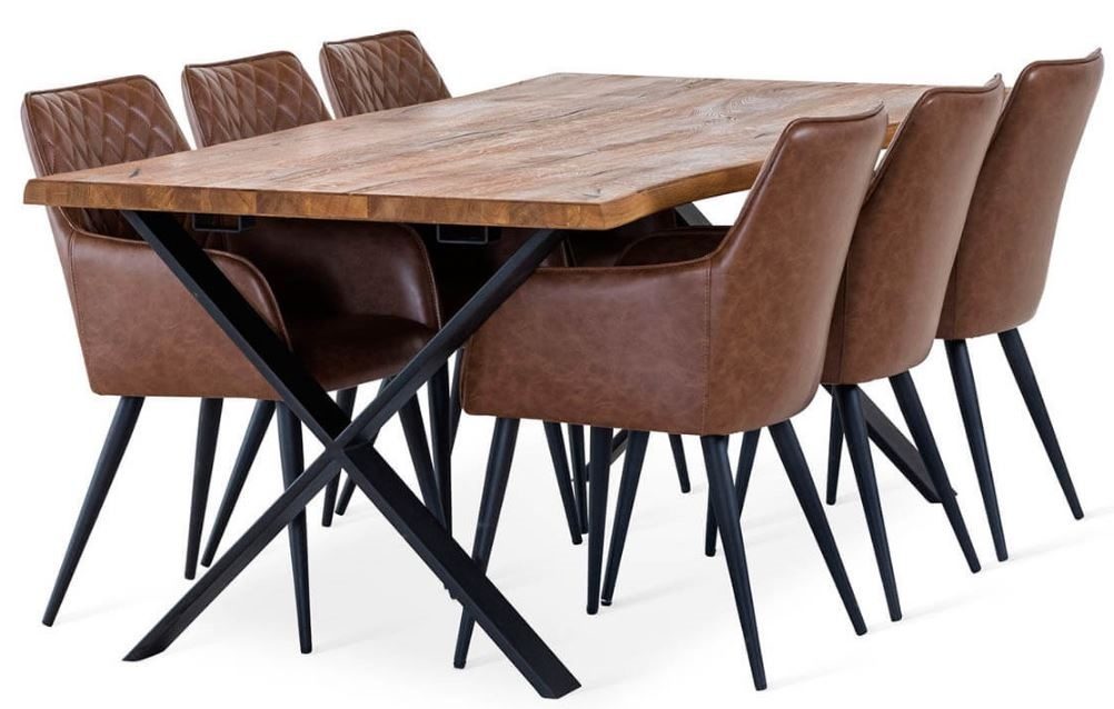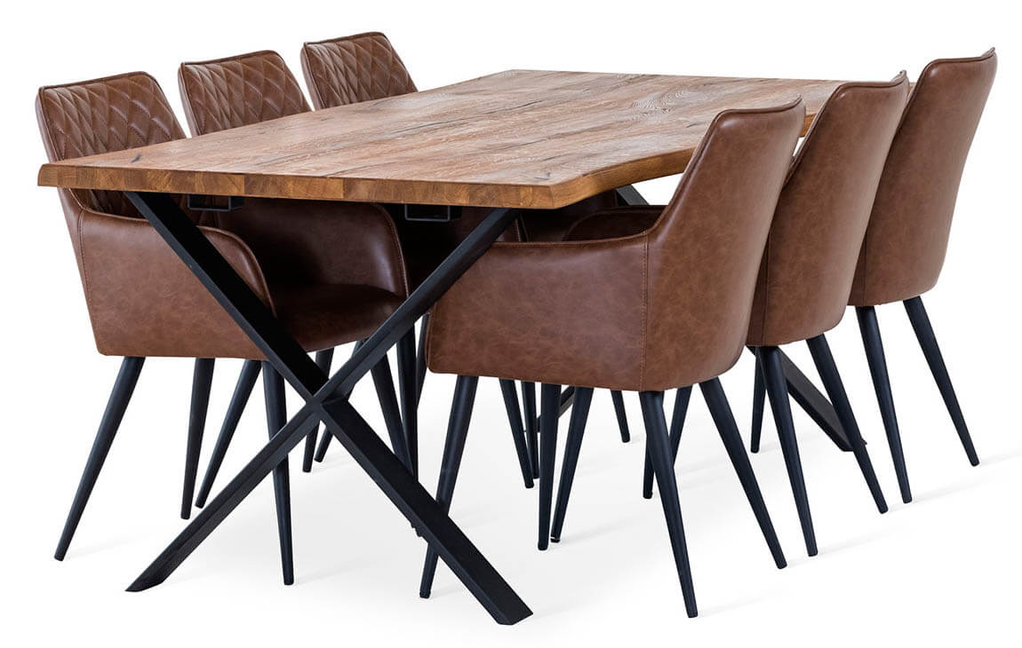 Ryhmään sisältyy 6 kappaletta mustia Nova-tuoleja, joissa metallijalat ja musta keinonahkaverhoilu yhdistävät helppohoitoisuuden ja modernin tyylin. Ergonominen muotoilu ja miellyttävä istuinkorkeus tekevät tuoleista mukavat myös pidempiin ruokailuhetkiin, ja musta väritys sopii täydellisesti rustiikkisen tammipöydän rinnalle.