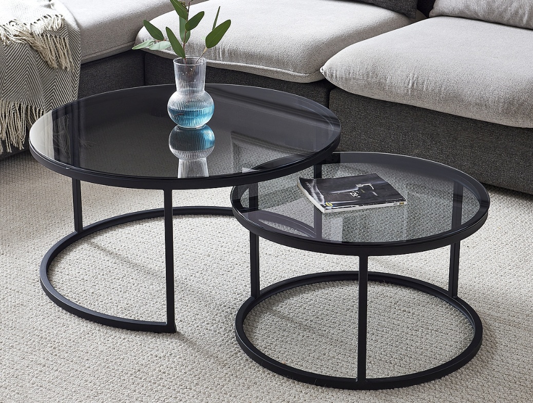 Vahva musta metallirunko ja karkaistu lasi takaavat pitkäikäisen rakenteen, ja kahden eri kokoisen pöydän yhdistelmä tarjoaa käytännöllisyyttä ja visuaalista tasapainoa.