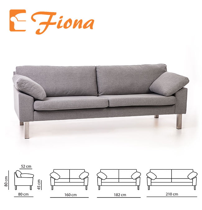 Fiona 2 ist sohva sohva on moderni, tyylikäs ja monipuolinen valinta, joka tarjoaa sekä mukavuutta että käytännöllisyyttä. Runko on laadukasta massiivipuuta, kalustelevyä sekä vaneria. Fiona sohvan istuin- ja selkänojantyynyt ovat irralliset ja verhoilu on vetoketjulla irroitettavissa. Sohvan tausta on myös viimeistelty, joten sijoitus huoneen keskelle on myös mahdollista. Lisäksi sohvaan kuuluu kaksi sisustustyynyä samalla kankaalla verhoiltuna. Lisävalinnoista voit myös tilata sohvaan lisää sisustustyynyjä.