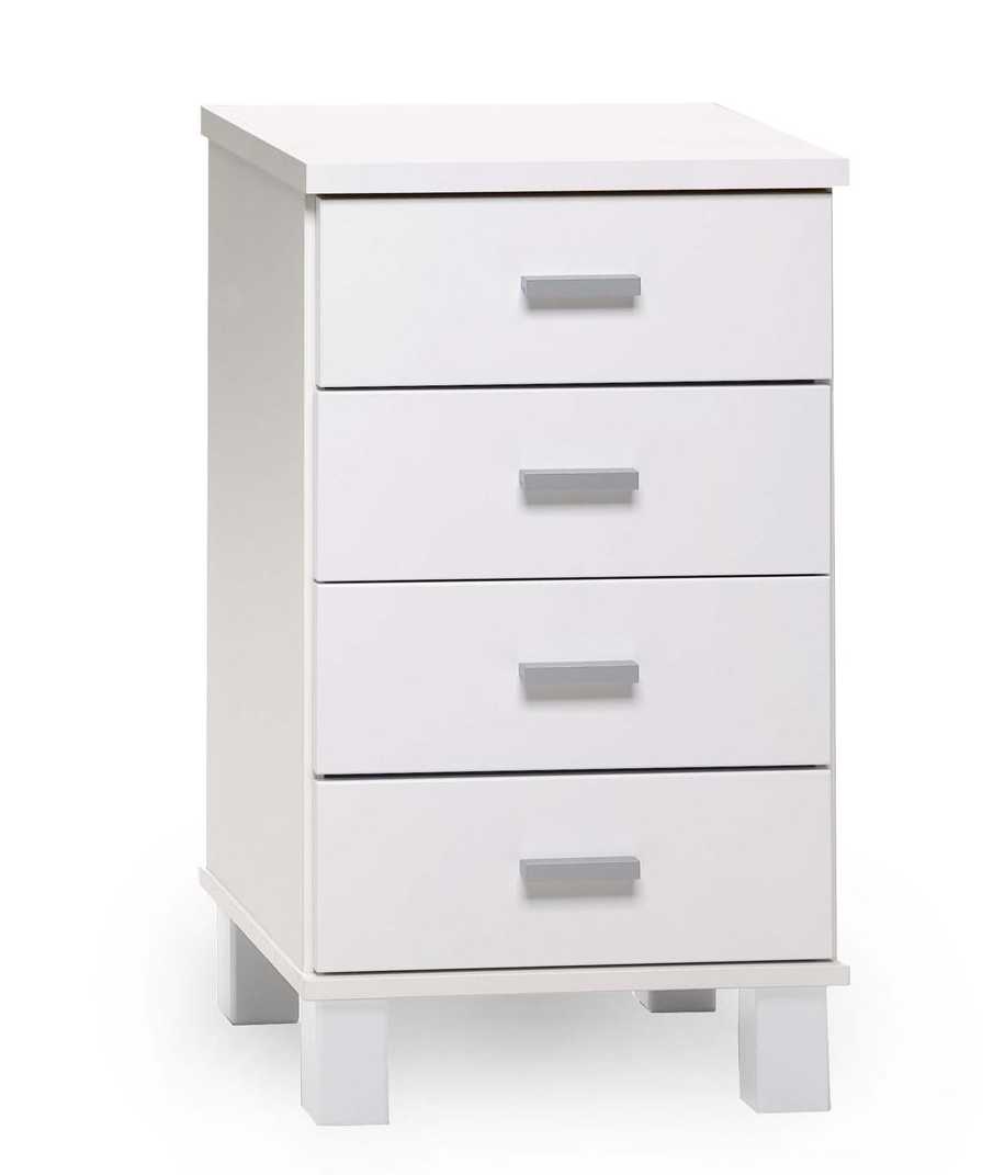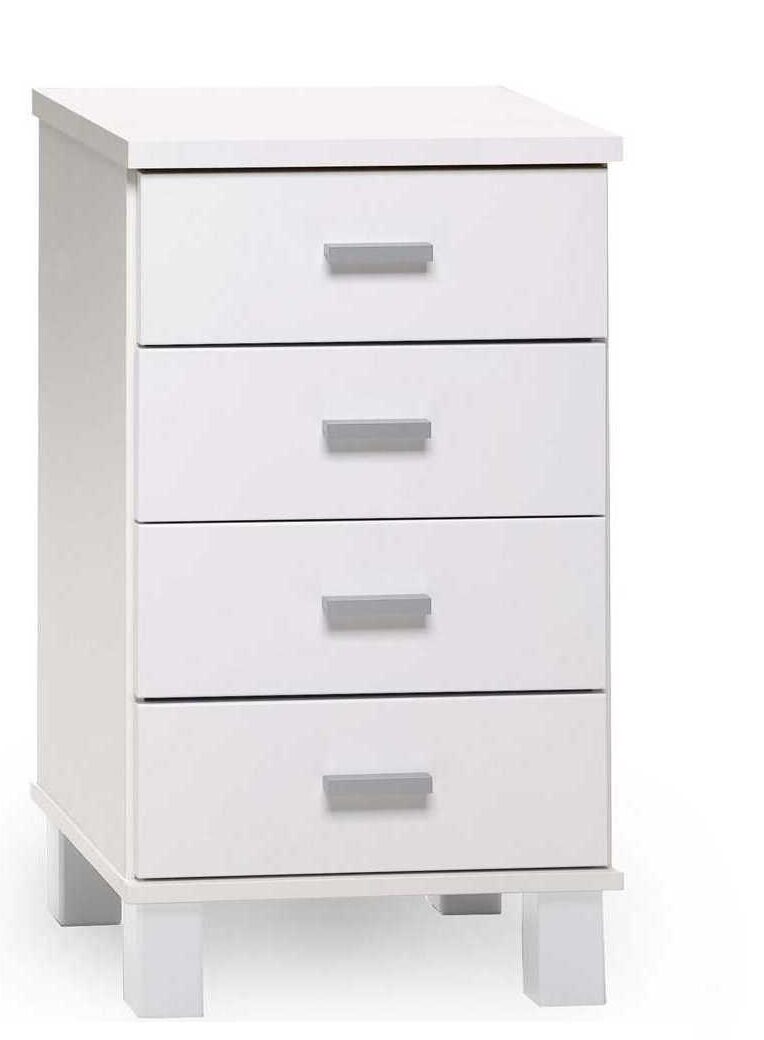 Runko on kestävää valkoista melamiinia, edustat maalattua MDF-levyä ja jalat massiivipuuta. Alumiiniset vetimet lisäävät ripauksen modernia tyylikkyyttä ja varmistavat pitkäikäisen käytön. Kompakti koko (41 × 41 × 74 cm) sopii myös pienempiin tiloihin, tarjoten silti runsaasti säilytystilaa.
