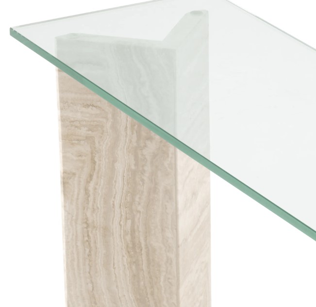 Kirkkaan lasin ja beigen travertiinikiven yhdistelmä tuo tilaan ajattoman ja kestävän kokonaisuuden. Luonnonkiven lämmin sävy ja lasin ilmavuus muodostavat harmonisen kontrastin, joka sopii monenlaisiin sisustustyyleihin.