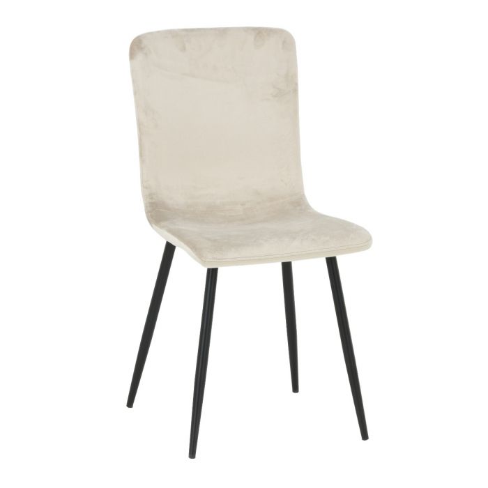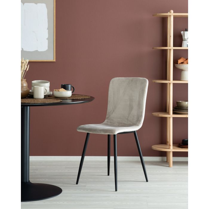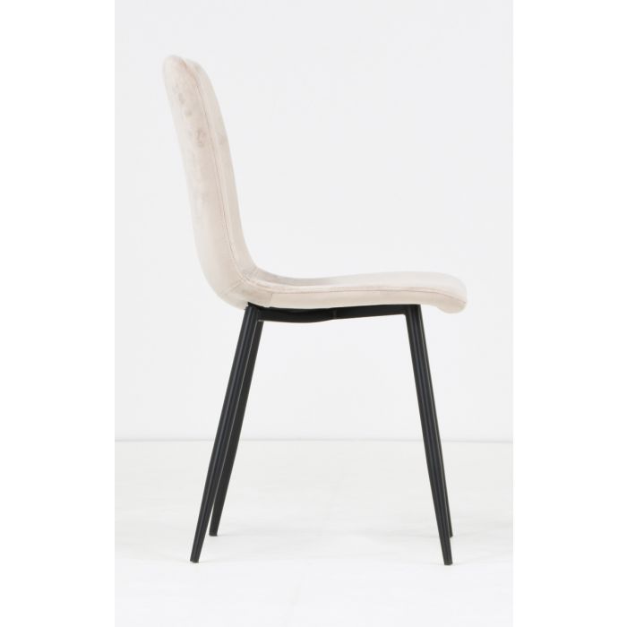 Gabi-ruokatuoli hurmaa sirolla muotoilullaan ja pehmeällä beigellä samettiverhoilulla, joka tuo ruokailutilaan lämpöä ja ylellistä tunnelmaa. Mustat pulverimaalatut metallijalat tuovat tuoliin ryhtiä ja modernia kontrastia, tehden kokonaisuudesta kevyen mutta näyttävän.