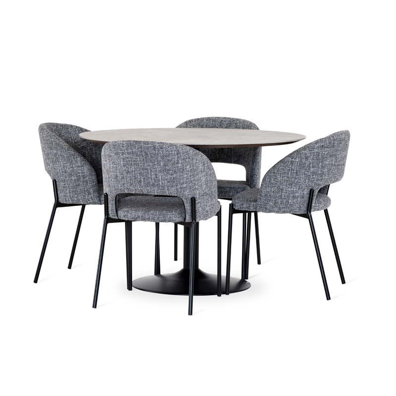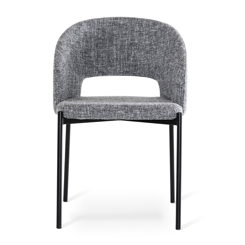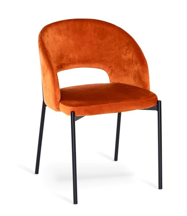 Mustat metallijalat tuovat tuoliin ryhdikkyyttä ja kestävyyttä. Verhoiluvaihtoehtoina ovat näyttävä tiilen/oranssi samettikangas tai hillitty harmaa tekstiilikangas, joten voit valita sisustukseesi parhaiten sopivan vaihtoehdon. Tuoli toimitetaan osissa, jalkaosa irrallaan.