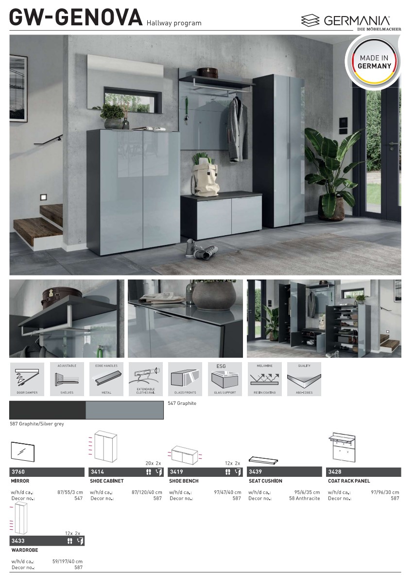 Genova kenkäkaappi 3414 hurmaa tyylikkäällä, vetimettömällä ulkoasullaan, joka tuo eteiseen modernia selkeyttä ja viimeisteltyä ilmettä. Se sulautuu vaivattomasti monenlaiseen sisustukseen ja täydentää Genova-sarjan kokonaisuuden näyttävästi.