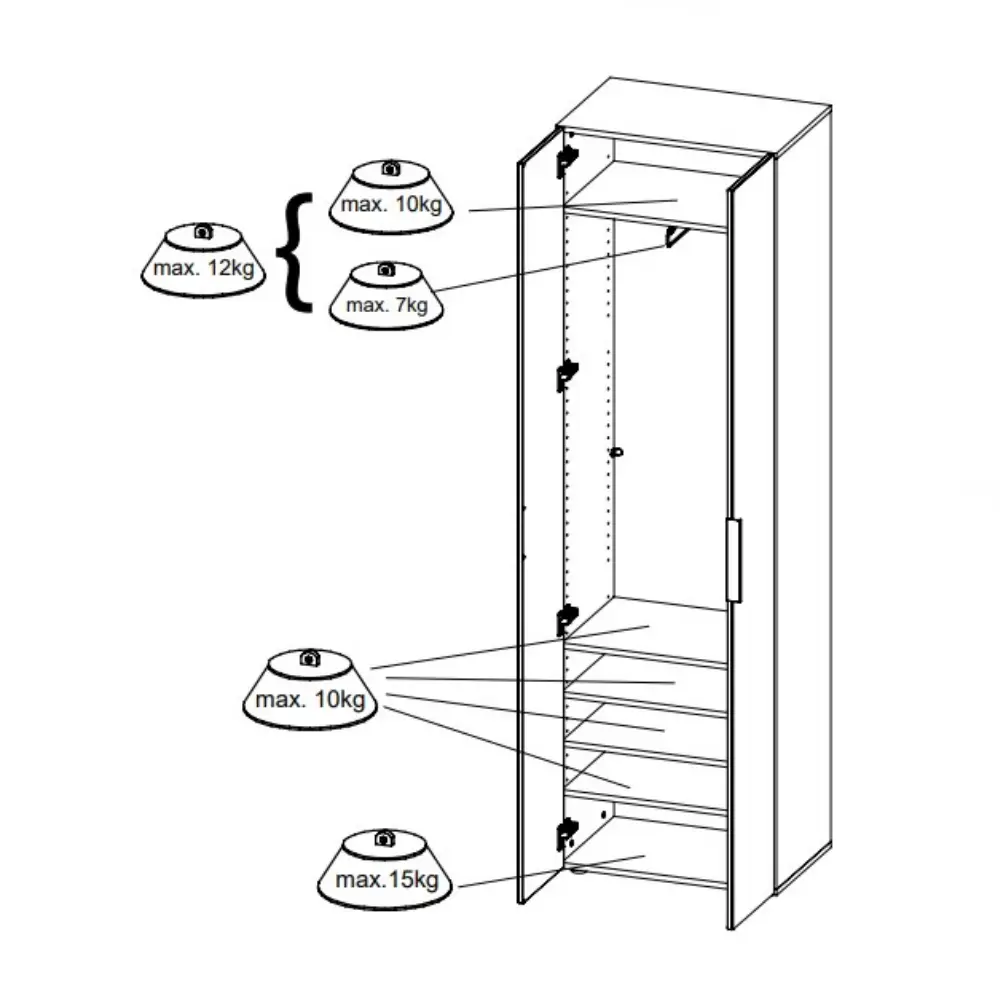 Kahden oven taakse kätkeytyy viisi korkeussäädettävää hyllyä sekä ulosvedettävä vaatenaulakko, jotka tarjoavat runsaasti muokattavaa tilaa vaatteille ja asusteille. Kaapin toiminnallisuus tekee arjen järjestyksestä helppoa ja tehokasta, oli tila sitten suuri tai pieni.
