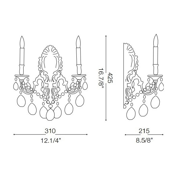 Tyylikäs 2-haarainen Gioconda kristalliseinävalaisin huokuu perinteistä eleganssia ja hienostunutta luksusta. Metallirunko yhdistettynä kirkkaisiin, kahdeksankulmaisiin kristallielementteihin luo säihkyvän kokonaisuuden, joka tuo arvokkuutta niin klassiseen kuin moderniin sisustukseen.