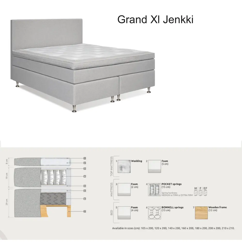 Grand XL -jenkkisänky yhdistää yksilöllisen muunneltavuuden, laadukkaan tuen ja ylellisen mukavuuden yhteen kokonaisuuteen. Se tekee jokaisesta yöstä levollisen ja palauttavan, ja tarjoaa unenlaatua, johon on helppo rakastua.
