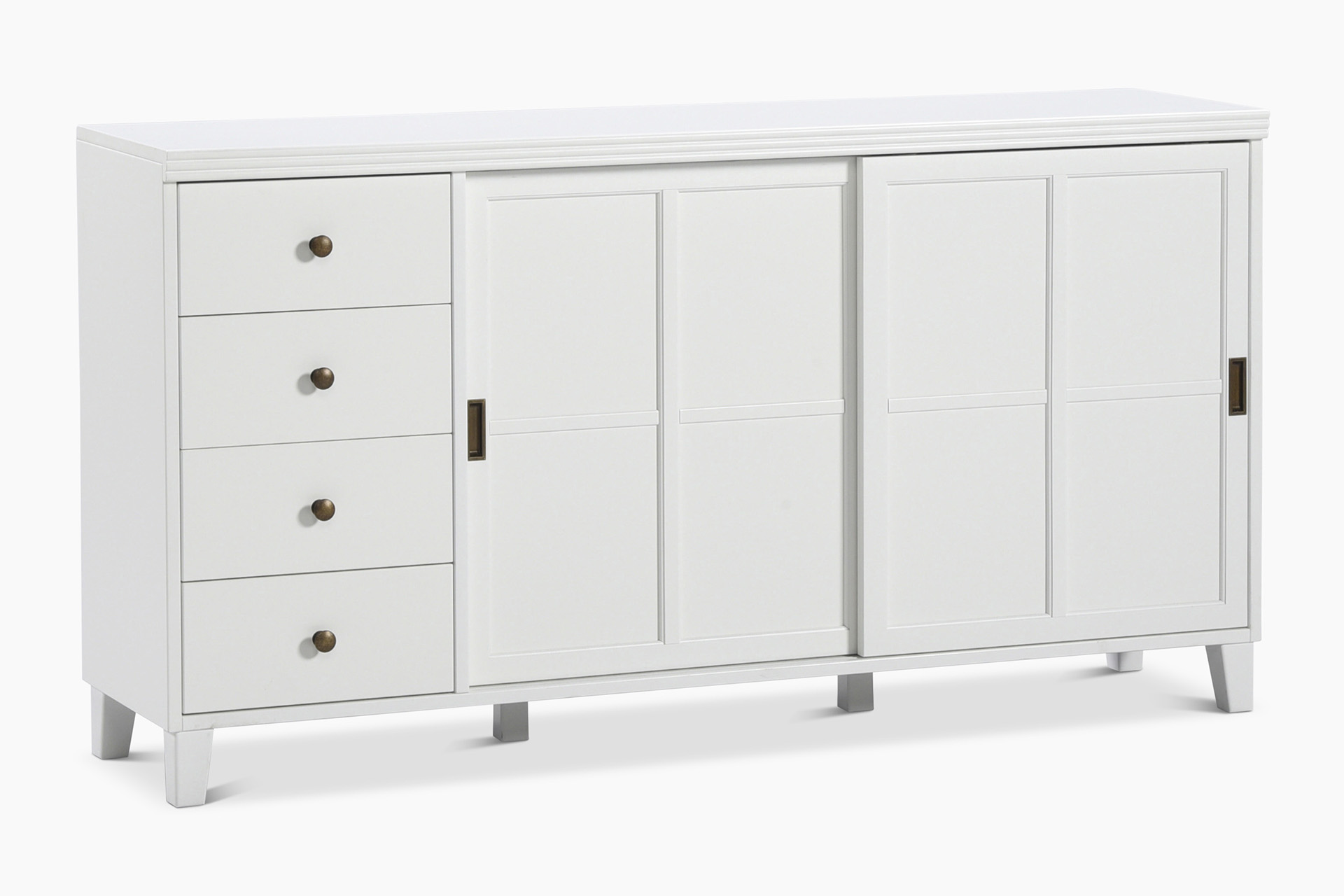 Neljän vetolaatikon ja kahden liukuovellisen kaapin ansiosta saat reilusti säilytystilaa niin pienille kuin suuremmillekin tavaroille. Tukevat levyhyllyt ja keskellä olevat hyllyn kannakkeet varmistavat, että myös painavat esineet säilyvät turvallisesti ja järjestyksessä.