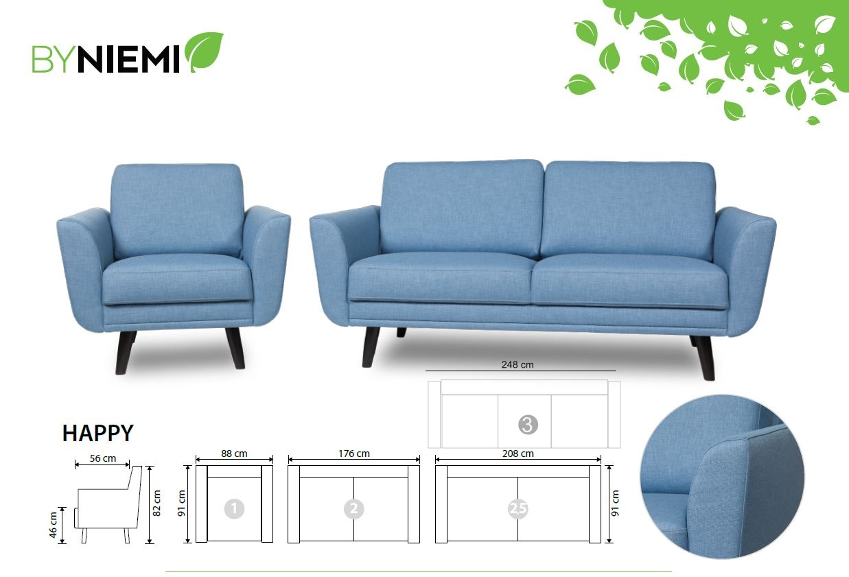 Happy-nojatuoli on täydellinen yhdistelmä modernia tyyliä ja ajattoman eleganttia tyyliä. Se on suunniteltu kestämään sekä käyttöä että katseita – vuodesta toiseen. Happy-sohvan selkeälinjainen muotoilu yhdistyy pehmeisiin yksityiskohtiin, jotka sopivat monenlaiseen sisustukseen. Kompaktin kokonsa ansiosta se sopii erinomaisesti niin olohuoneeseen, vierashuoneeseen kuin pienempiin tiloihin.
