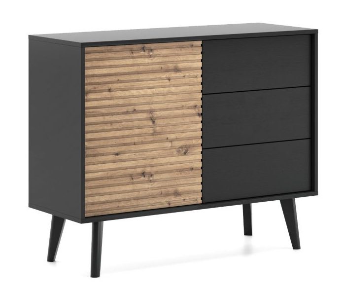 Lipastossa on kolme laatikkoa ja yksi kaappi välihyllyllä, mikä tarjoaa runsaasti monipuolista säilytystilaa kodin eri tarpeisiin. Push-to-open-mekanismi tekee laatikoiden ja oven käytöstä sulavaa ja modernia, ja 18 mm MDF-etusarjat urakuvioineen tuovat kokonaisuuteen yksilöllisen viimeistelyn.