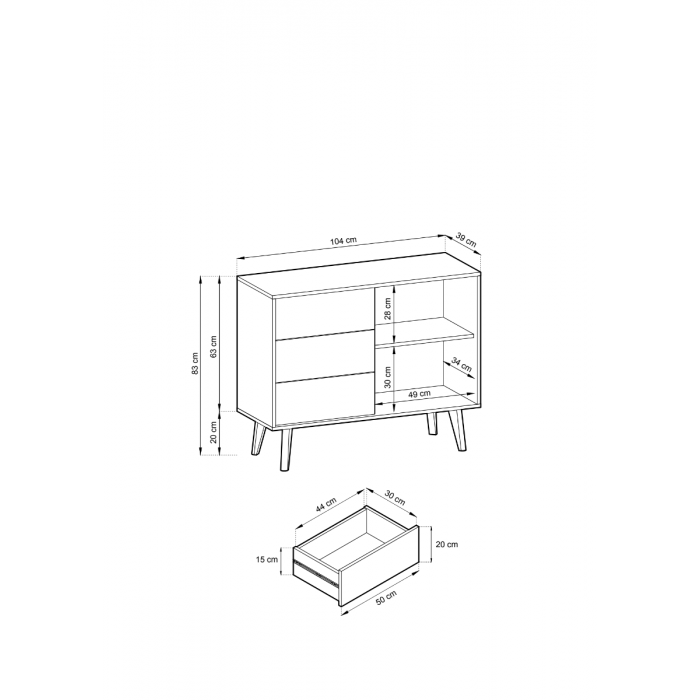Leveydeltään 104 cm, syvyydeltään 39 cm ja korkeudeltaan 83 cm oleva lipasto on käytännöllisen kokoinen ja helppo sijoittaa niin olohuoneeseen, eteiseen kuin makuuhuoneeseenkin. Toimitus osina tekee käsittelystä ja kokoamisesta vaivatonta.