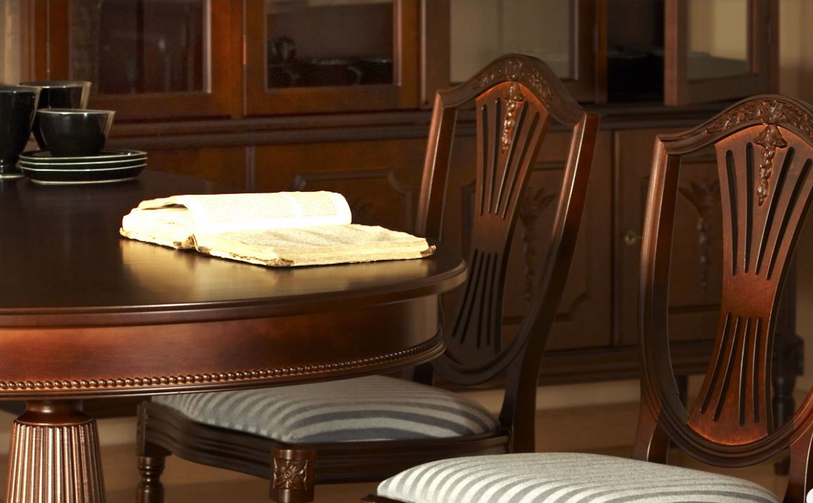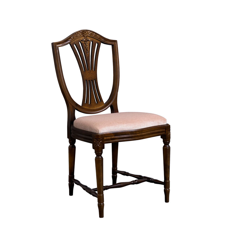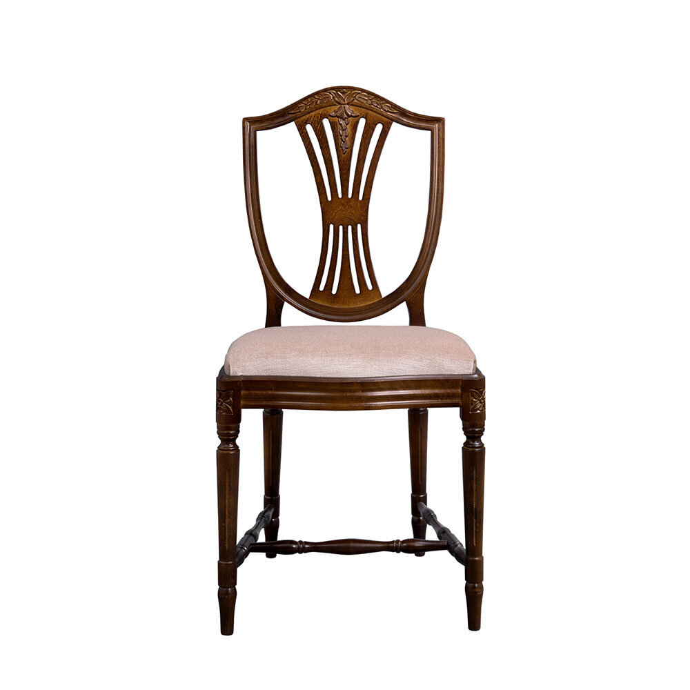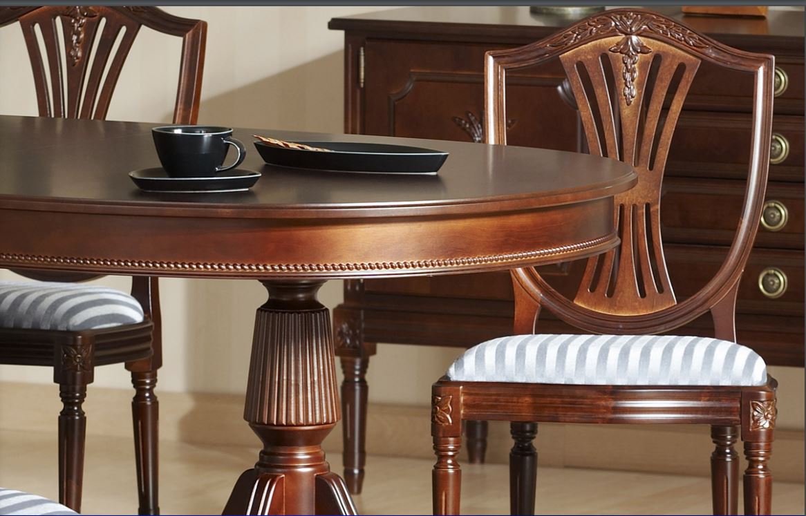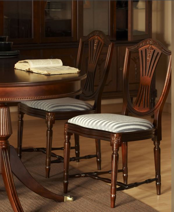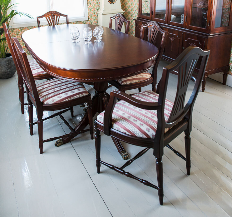 Hepplewhite-ruokailuryhmä 6 tuolilla ja kahdella jatkolla jolloin voit jatkaa pöydän koko vieraiden lisääntyessä aina 280 cm pitkäksi ruokapöydäksi. Tuttavallisemmin harppuempire, on elegantti empiretyylinen ruokailuryhmä, jossa tuoleissa kilvenmuotoinen selkänoja ja lyhdeselusta henkivät hienostunutta klassismia. Tyylisuunta on saanut nimensä englantilaiselta mestaripuusepältä George Hepplewhitelta, jonka luomukset ovat vaikuttaneet huonekalumuotoiluun sukupolvesta toiseen.