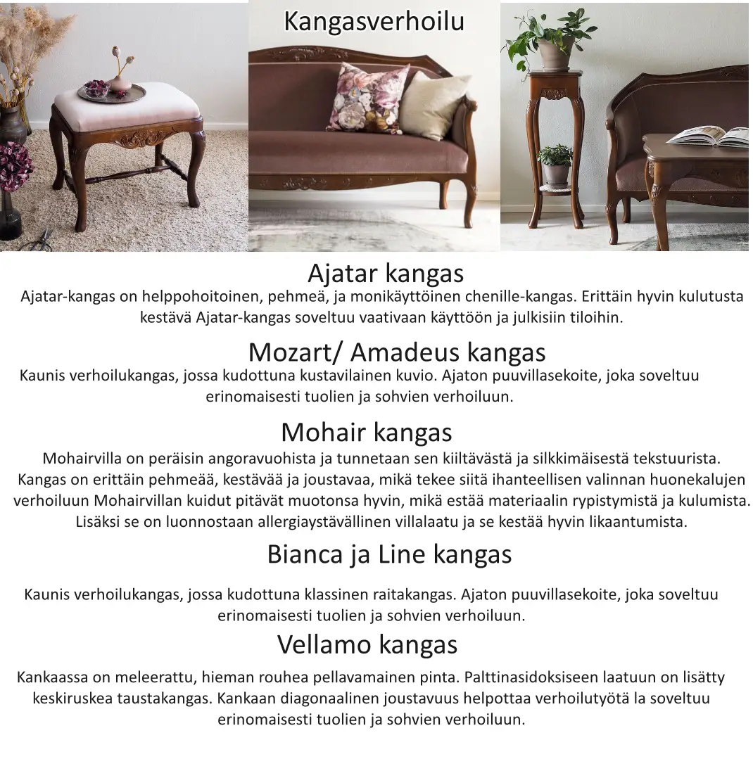 Tuoli on saatavissa useilla eri verhoilukankailla – myös asiakkaan omasta kankaasta, jolloin lopputulos on täysin yksilöllinen.