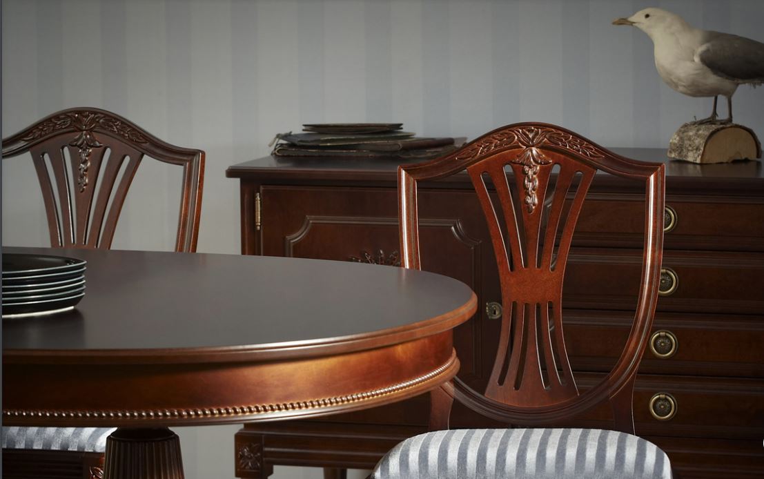 Empirekalusteet sulautuvat kauniisti myös kustavilaisten huonekalujen rinnalle. Sävyksi suosittelemme perinteikästä mahonkia tai Hepplewhite-väriä – vaihtoehtoisesti voit valita kustavilaisesta maailmasta tutun helmenharmaan.