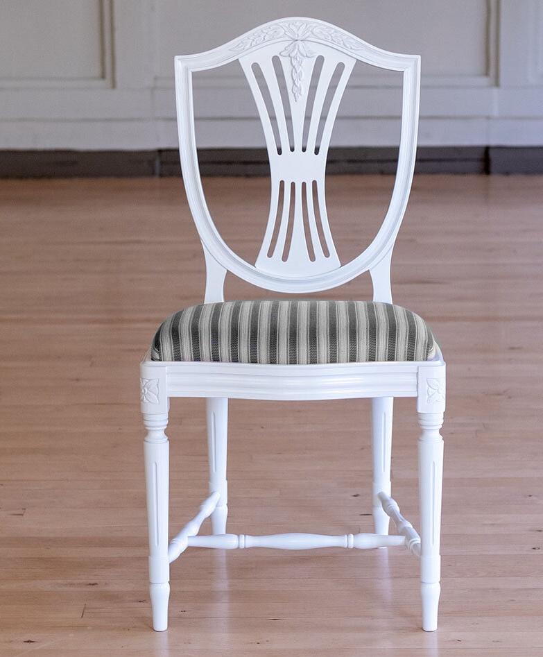 Kotimainen Hepplewhite-tuoli on empiretyylin klassikko, jossa kilvenmuotoinen selkänoja ja lyhdeselusta tuovat ajattoman arvokkuuden kotiisi. Valittavissa useilla verhoilukankailla, puuväreillä ja patinoinneilla – juuri sinun sisustukseesi räätälöitynä