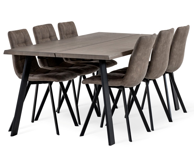 Ryhmään sisältyy 6 kappaletta Ruth-tuoleja, joissa mustat metallijalat ja laadukas Niila-mikrokuitukangasverhoilu yhdistävät modernin ilmeen ja erinomaisen istuinmukavuuden. Saatavilla olevat sävyt – beige, ruskea ja tummanharmaa – mahdollistavat harmonisen kokonaisuuden luomisen ruokailutilaan. Ergonominen mitoitus takaa miellyttävän istumisen myös pidempiin ruokailuhetkiin.