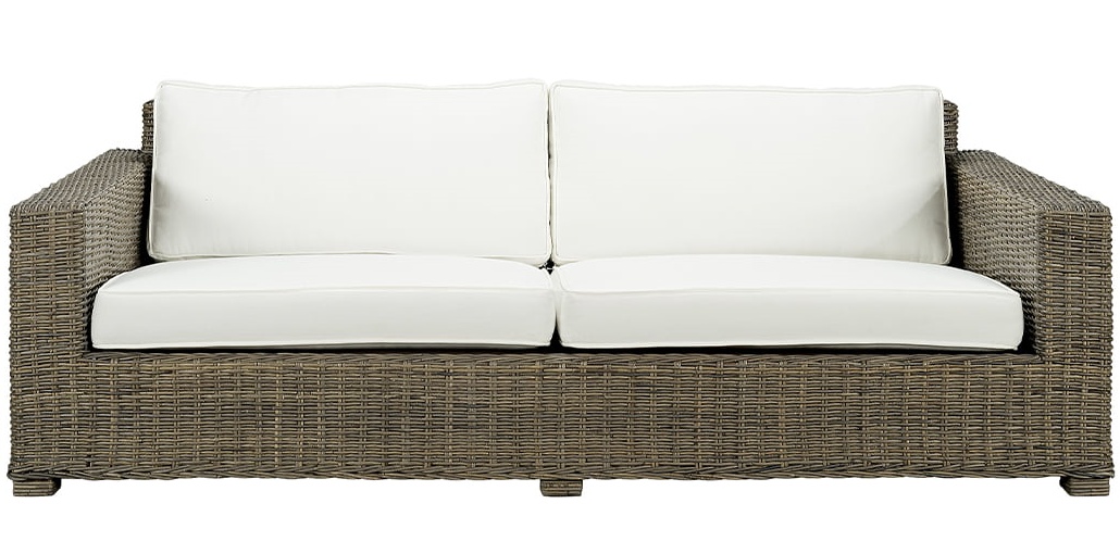 Hudson 3-istuttava rottinkisohva tuo katetulle terassille tyylikkään ja luonnonläheisen ilmeen, jossa harmaanruskea rottinki ja luonnonvalkoiset istuintyynyt muodostavat harmonisen ja rauhallisen kokonaisuuden.