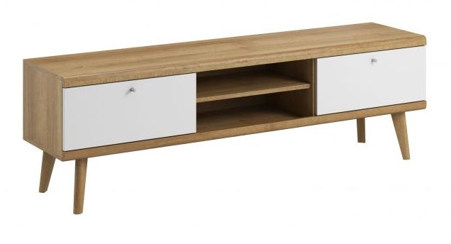 Jasmin tv-taso yhdistää kauniisti tammen lämpimän sävyn ja valkoisten etusarjojen raikkauden, tuoden olohuoneeseen modernia ja harmonista ilmettä. Laadukas 16 mm laminoitu runko, ABS-reunanauhat, tyylikkäät alumiinivetimet ja tukevat tammijalat viimeistelevät kokonaisuuden pitkäikäiseksi ja näyttäväksi kalusteeksi.