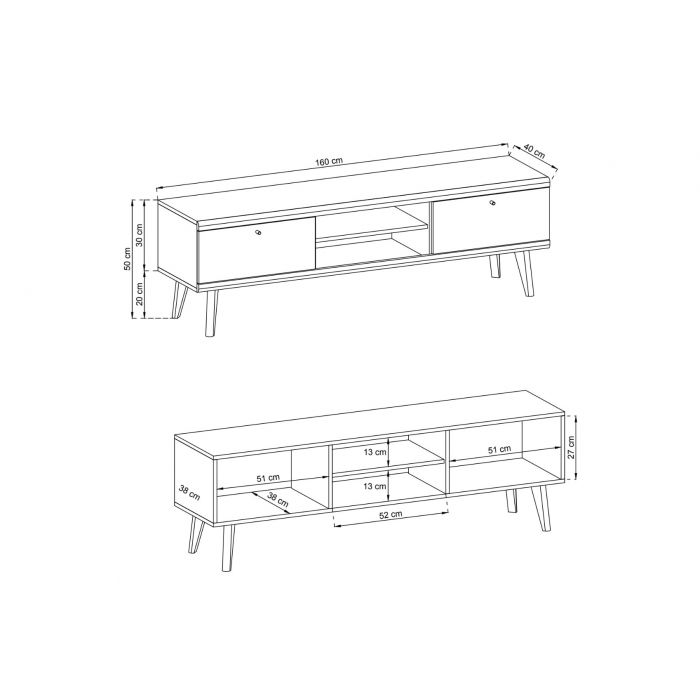 Tv-tasossa on kaksi kippiovellista kaappia, jotka tarjoavat kätevää piilosäilytystä, sekä avohyllyt laitteille ja koriste-esineille. Reilut mitat – leveys 160 cm, syvyys 40 cm ja korkeus 50 cm – tekevät tasosta erinomaisen valinnan niin suurelle televisiolle kuin monipuoliselle elektroniikalle.