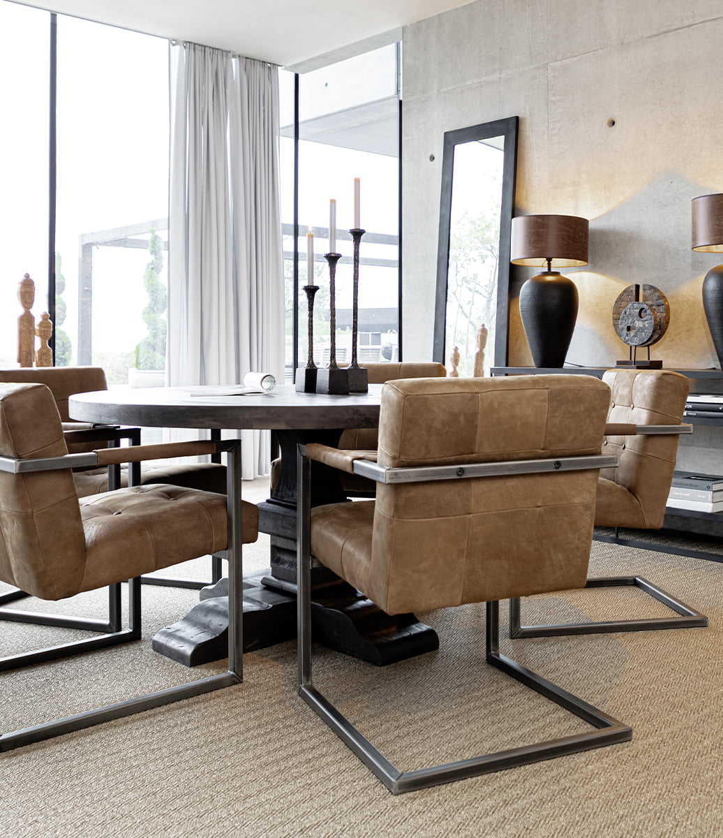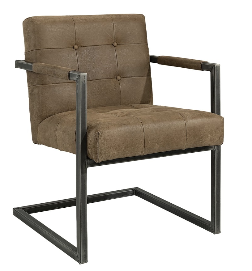 Kestävästä metalliputkesta valmistettu runko ja aito ruskea nupukkinahkaverhoilu tuovat tuoliin ylellisyyttä, kun taas vanerista valmistettu selkänoja ja istuin kylmävaahtopehmusteella tarjoavat optimaalista ergonomiaa.