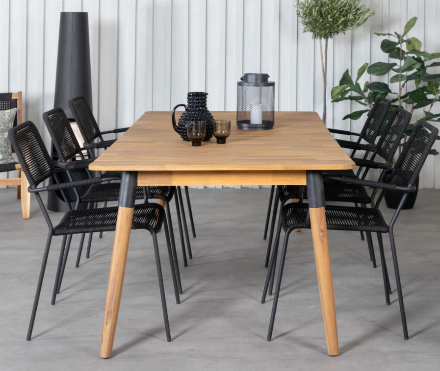 Julian, suorakaiteen muotoinen tyylikäs ruokapöytä, jossa on tilaa monelle. Pöytä on valmistettu ruskeasta akaasiasta ja siinä on tyylikkäät mustat yksityiskohdat jotka antavat pöydälle mukavan ylellisyyden. Kutsu perhe ja ystävät upealle ulkoillalliselle tulevana kesänä! Jotta puiset ulkokalusteet säilyttäisivät viimeistelynsä, ne tulee olla öljykäsitelty.