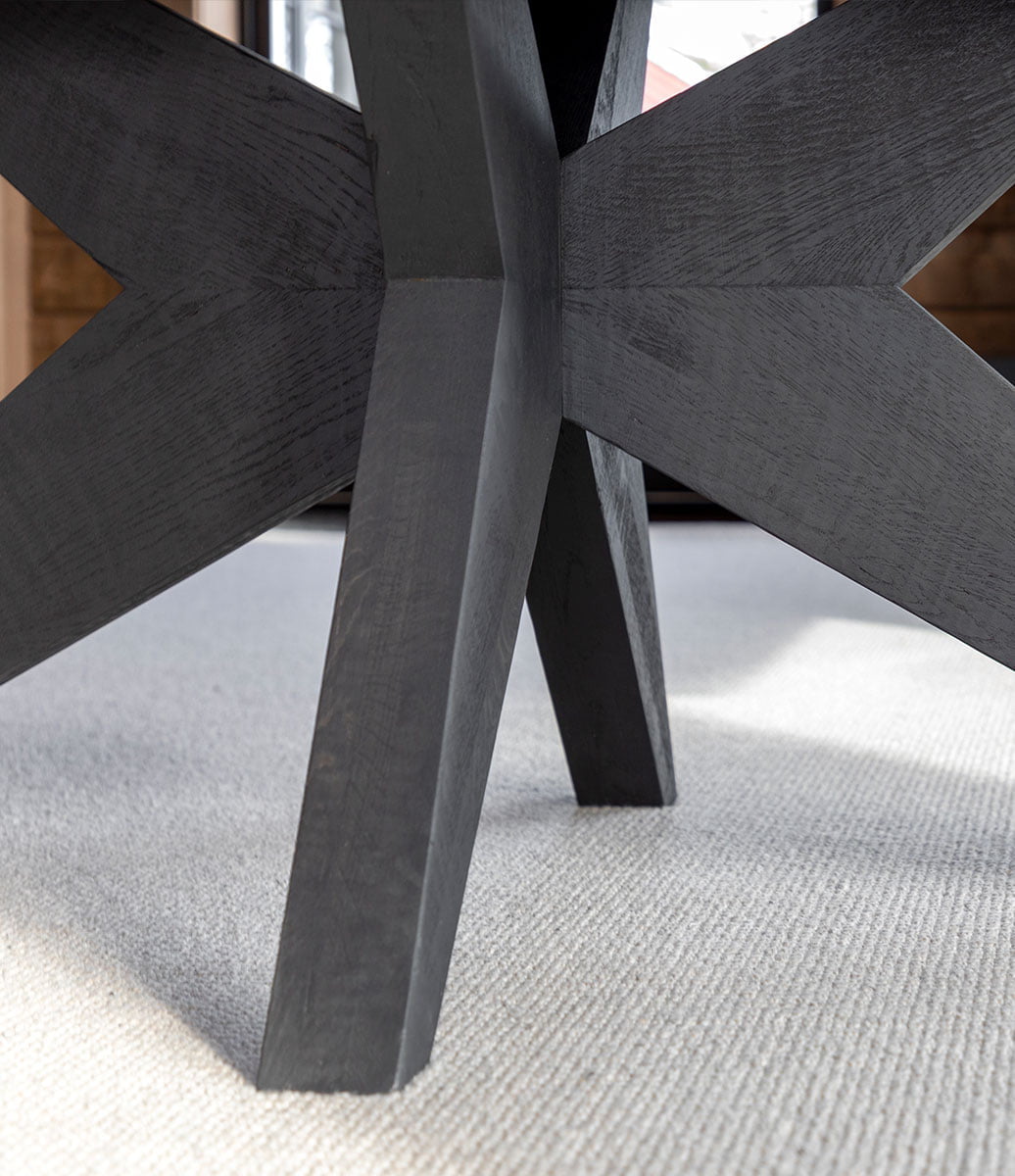 Kestävä massiivitammi ja tammiviilu, käsin käsitelty ja maalattu pinta sekä luonnolliset oksat ja halkeamat tekevät jokaisesta pöydästä uniikin ja pitkäikäisen huonekalun.