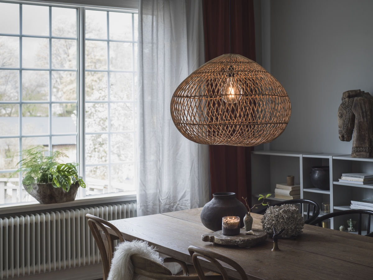 Karen-kattovalaisin on saatavana kolmessa eri koossa, joten voit valita juuri tilaan sopivan mittasuhteen tai yhdistellä eri kokoja näyttäväksi kokonaisuudeksi. Punottu rottinki suodattaa valon kauniisti, luoden lämpimän ja kutsuvan valaistuksen ilman häikäisyä.