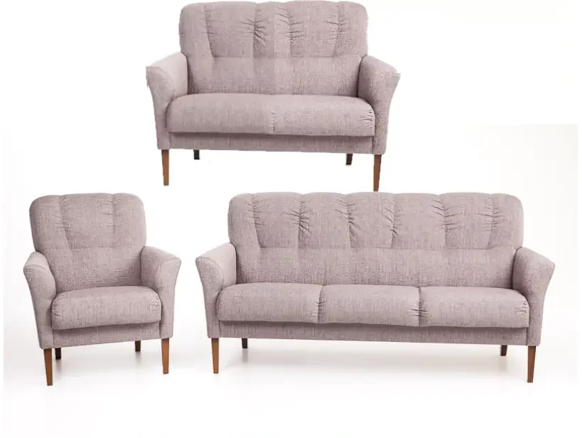 Katri sohvakalustoon kuuluu nojatuoli sekä 2 ja 3 ist sohvat. Valitse haluamasi määrä erikokoisia sohvia ja luo juuri sinun tarpeisiisi sopiva kokoonpano. omaa kauniin retron muotoilun, joka sopii moniin eri sisustuksiin. Pienen tilan Katri sohva tarjoaa sekä mukavuutta että käytännöllisyyttä. Runko on laadukasta massiivipuuta, kalustelevyä sekä vaneria, ja istuimissa on laadukas zig-zag jousitus ja selkänojassa kumivyöjousitus. Sohvan tausta on myös viimeistelty, joten sijoitus huoneen keskelle on myös mahdollista. Katri sohvan etujalat on hieman takajalkoja korkeammat. Viimeistele kokonaisuus tilaamalla tyylikkäät koristetyynyt.
