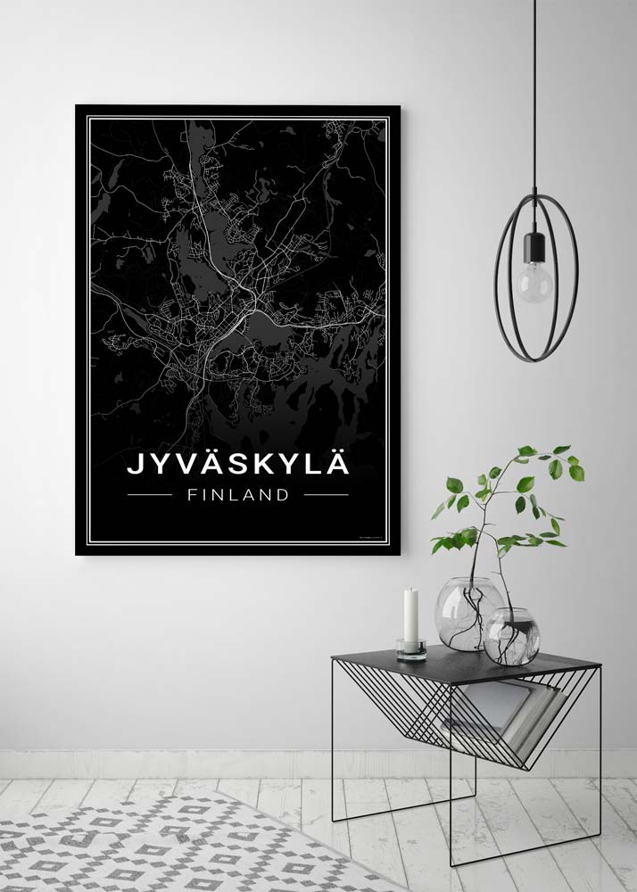 Jyväskylä kaupunkijuliste sopii täydellisesti olohuoneeseen, työtilaan tai lahjaksi kaupungin ystävälle. Lisäksi voit tilata kustomoidun julisteen mistä tahansa Suomen kaupungista, kunnasta tai kylästä tai haluamallasi tekstillä ottamalla yhteyttä asiakaspalveluumme.