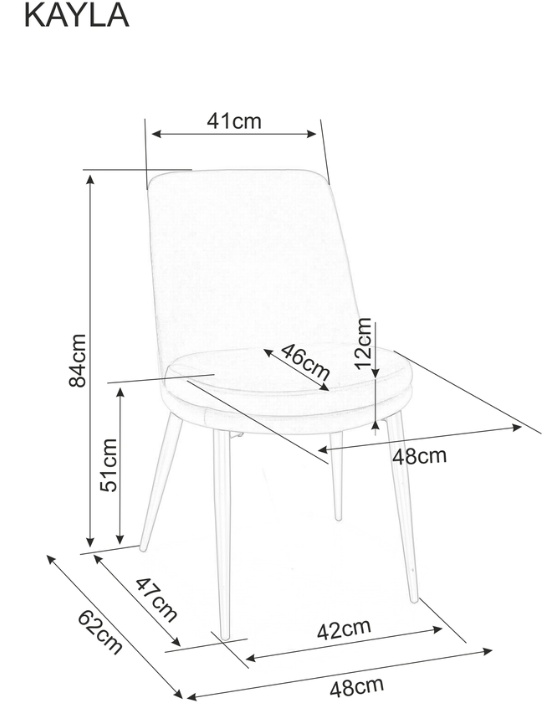 Kayla tuoli yhdistää modernin samettiverhoilun, tukevan metallirakenteen ja kevyen liikuteltavuuden, mikä tekee siitä monipuolisen ja elegantin valinnan kotiin. Se tarjoaa mukavat mitat ja kolme tyylikästä värivaihtoehtoa, jotka sulautuvat saumattomasti erilaisiin sisustuksiin.