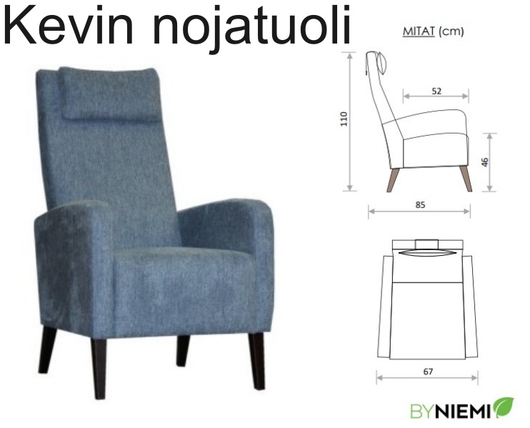 Kevin-nojatuolissa yhdistyvät laadukkaat ja kestävät materiaalit. Rungon muodostavat massiivihavupuu ja koivuvaneri, jotka varmistavat rakenteen tukevuuden. Tuolissa on nosag-jousitus, kiinteät istuin- ja selkätyynyt sekä palosuojattu HR-35-vaahtomuovi istuimessa ja E-25-vaahtomuovi selkänojassa – täydellinen yhdistelmä napakkuutta ja mukavuutta. Irrotettava niskatyyny, jonka täytteenä on pehmeä vanu, lisää tuolin käyttömukavuutta entisestään.