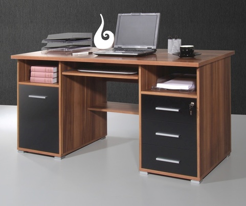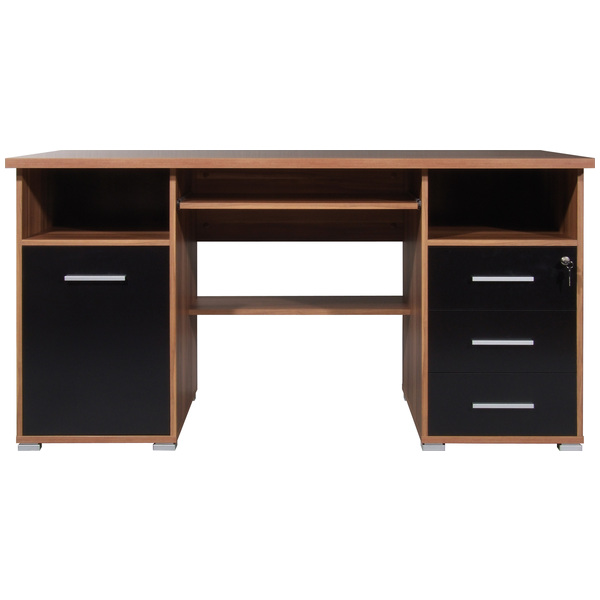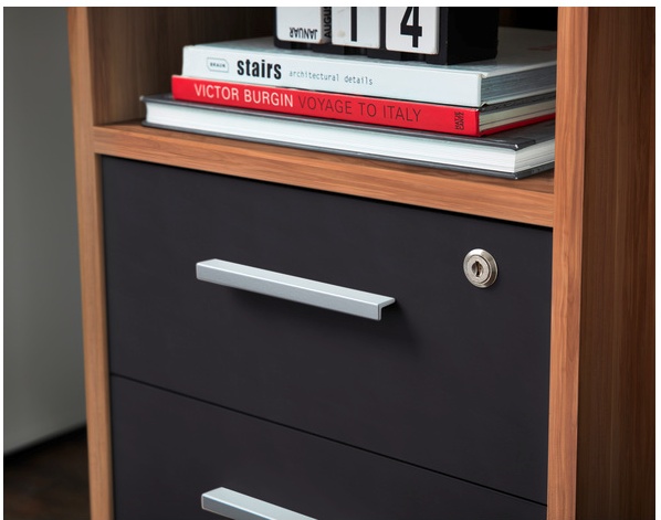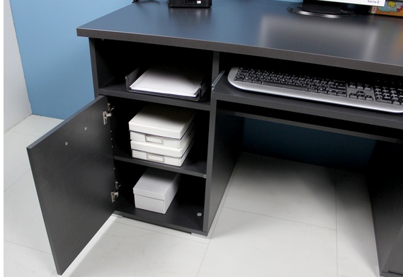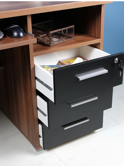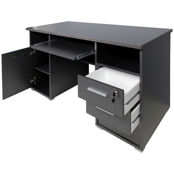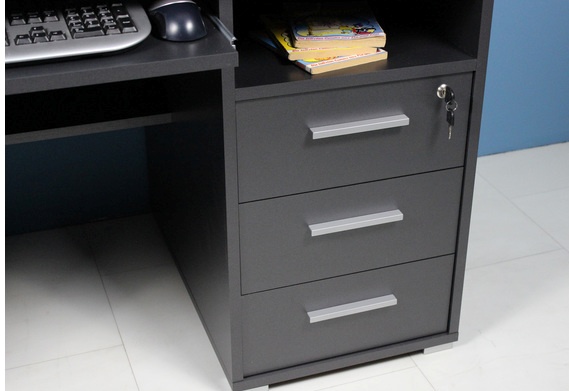 Kirjoituspöytä 0484 tarjoaa käytännöllisen säilytysratkaisun työhuoneeseen: vasemmalta löytyvä kaappi sisältää korkeussäädettävän hyllyn, avohylly pitää tärkeimmät tavarat käden ulottuvilla ja kolme laatikkoa – joista ylin lukittava – tuovat turvallisuutta sekä järjestystä arjen työskentelyyn.