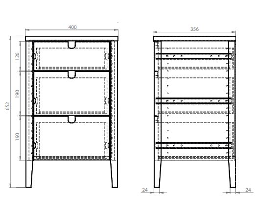 Laatiokossa on kolme tilavaa laatikkoa, jotka tarjoavat kätevää säilytystilaa vaatteille, asusteille ja muille arjen tavaroille. Kapea muotoilu hyödyntää tilan tehokkaasti ja sopii myös pienempiin huoneisiin.