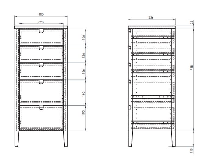 Laatiokossa on viisi tilavaa laatikkoa, jotka tarjoavat runsaasti säilytystilaa vaatteille, asusteille ja muille arjen tavaroille. Kompakti mutta korkea rakenne hyödyntää tilan tehokkaasti ja auttaa pitämään kodin siistinä ja järjestyksessä.