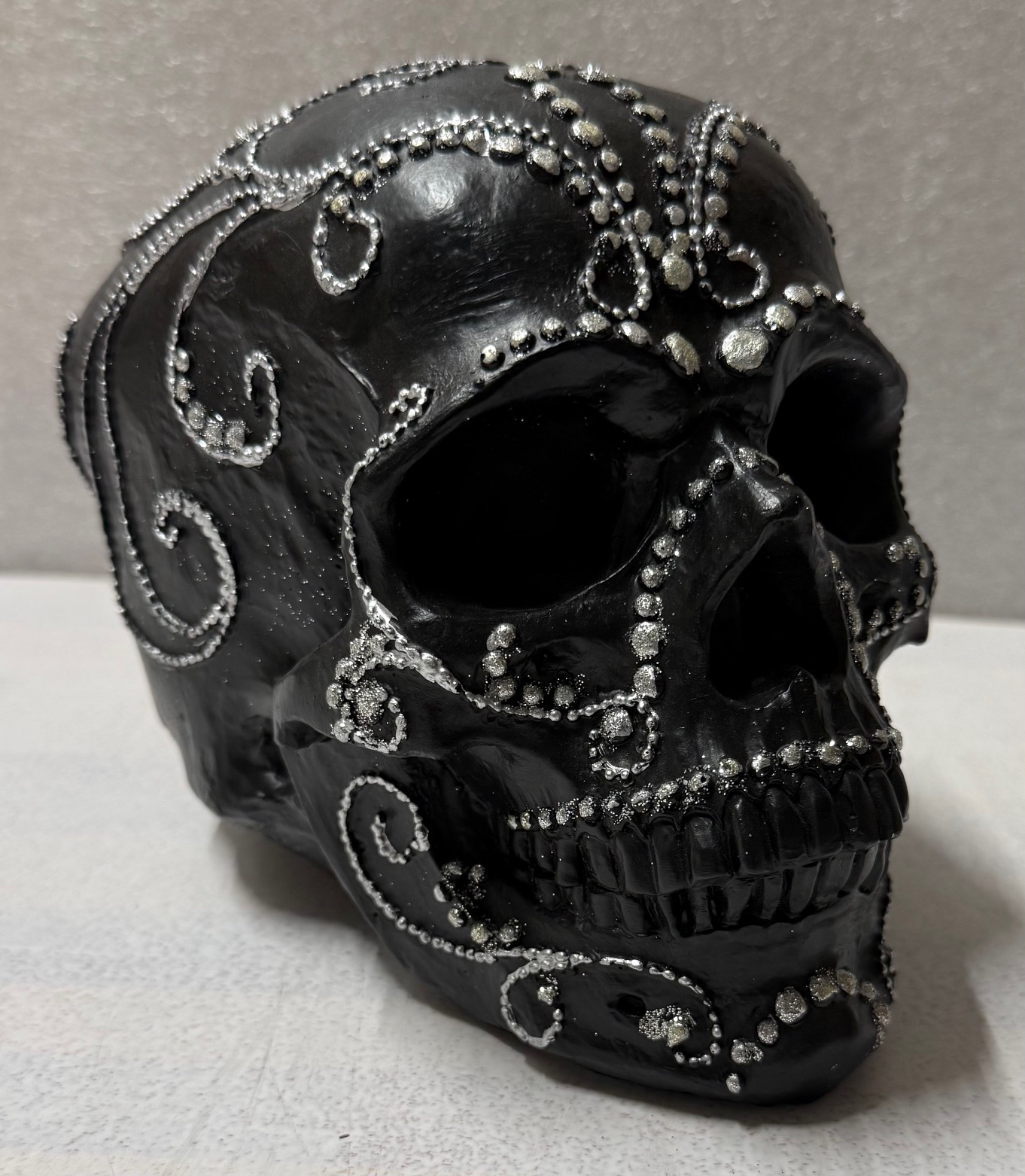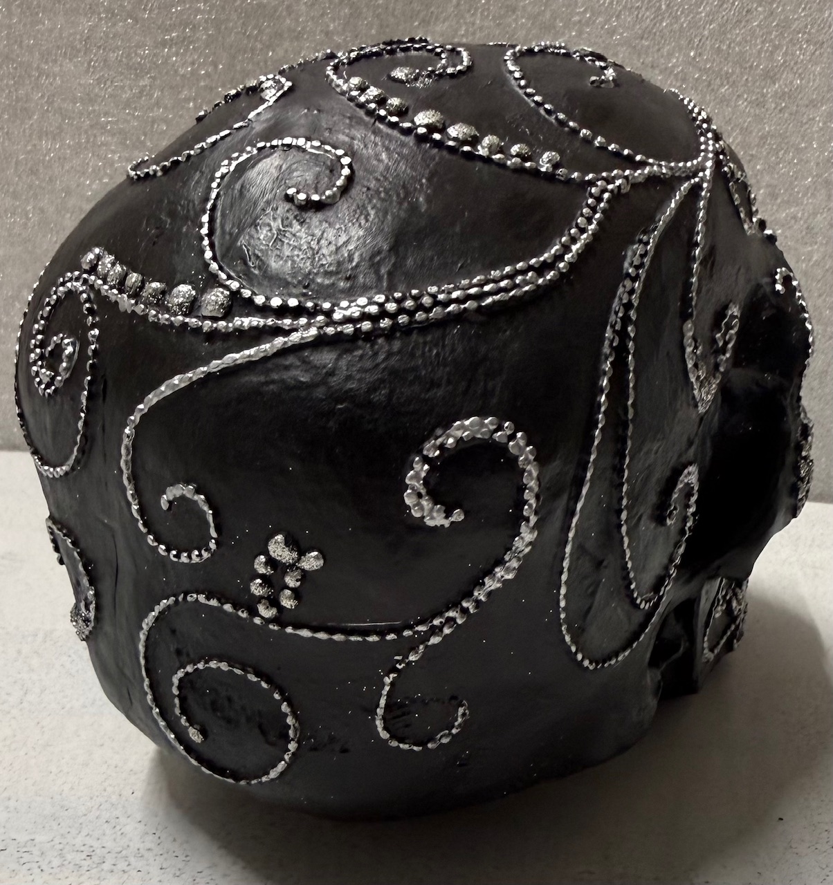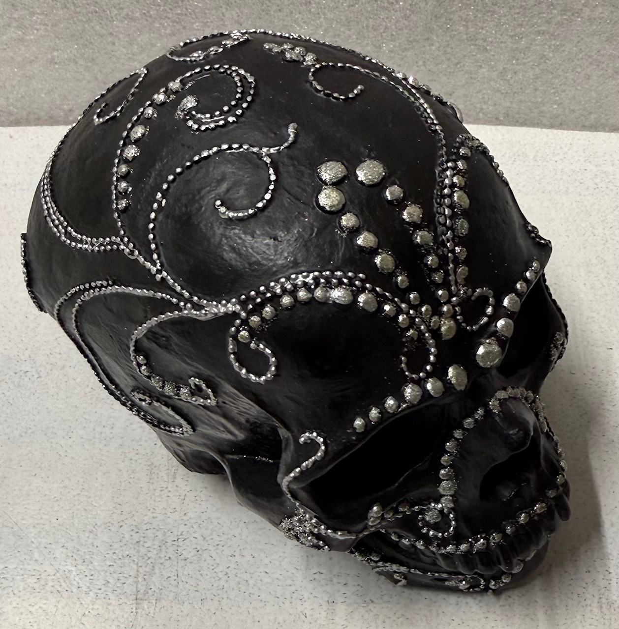 Koristepääkallo – Musta tuo tilaan näyttävää asennetta ja modernia kontrastia, tehden siitä sisustuksen voimakkaan katseenvangitsijan. Sen elegantti musta pinta yhdistettynä hopeisiin yksityiskohtiin luo ylellisen ja tyylikkään ilmeen, joka sopii moniin erilaisiin sisustustyyleihin.