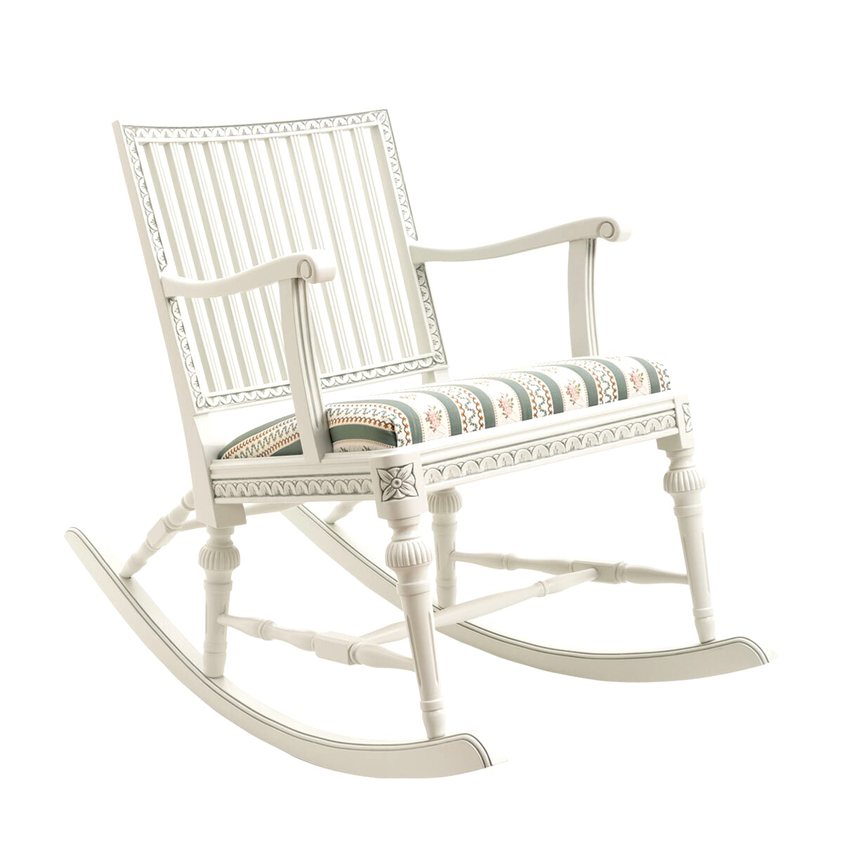 Keinuminen rentouttaa, aktivoi lihaksia ja tuo hyvinvointia arkeen, ja tyylikäs Kustavilainen muotoilu englantilaisvaikutteisine H-ristikkoineen ja keisarinlehtikoristeineen tekee tuolista kestävän sekä elegantin. Keinutuoli on saatavana useilla verhoiluvaihtoehdoilla, ja sen ilmettä voi korostaa käsin maalatulla kullan- tai harmaanvärisellä patinoinnilla.