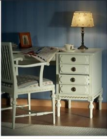 Tämä kotimainen Kustavilainen kirjoituspöytä yhdistää ajattoman tyylin ja fiksun säilytysratkaisun. Vasemmalla oleva kaappi sisältää yhden korkeussäädettävän hyllyn, keskellä on yksi laatikko ja oikealla neljä laatikkoa, tarjoten runsaasti tilaa työvälineille ja papereille. Tilaa kirjoituspöytään tuoli lisätarvikkeista